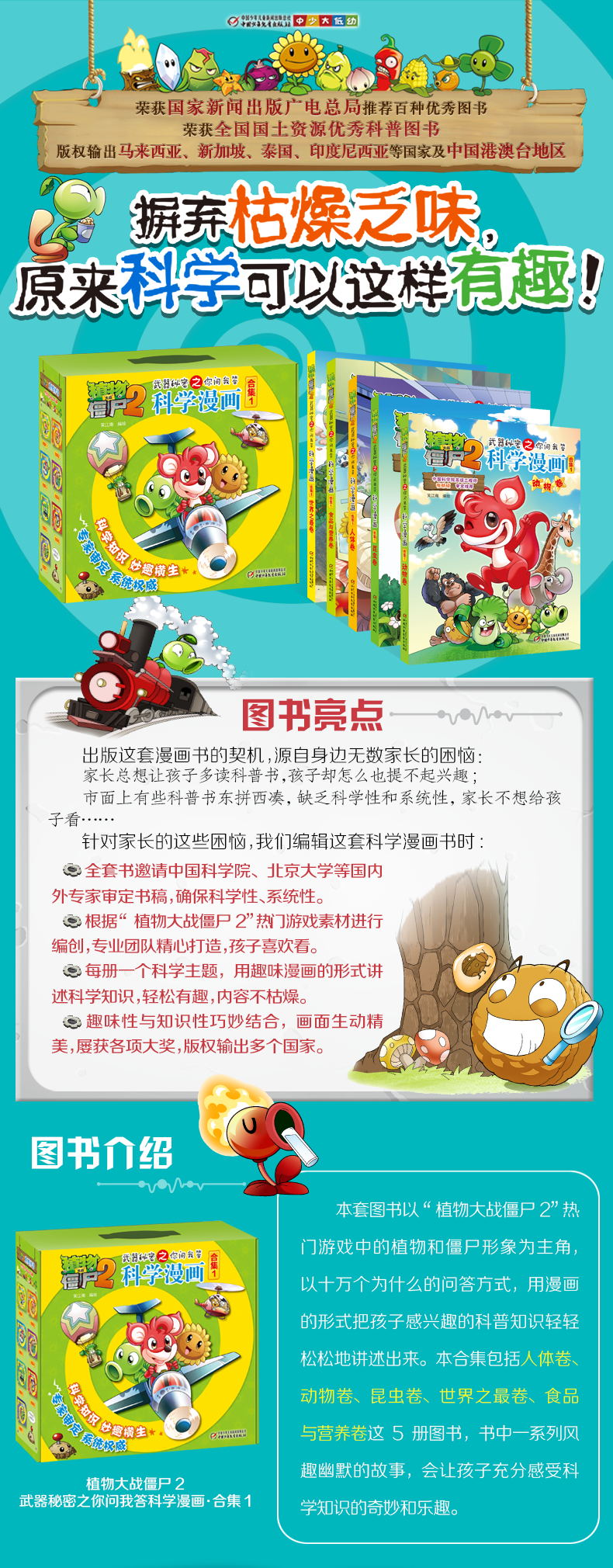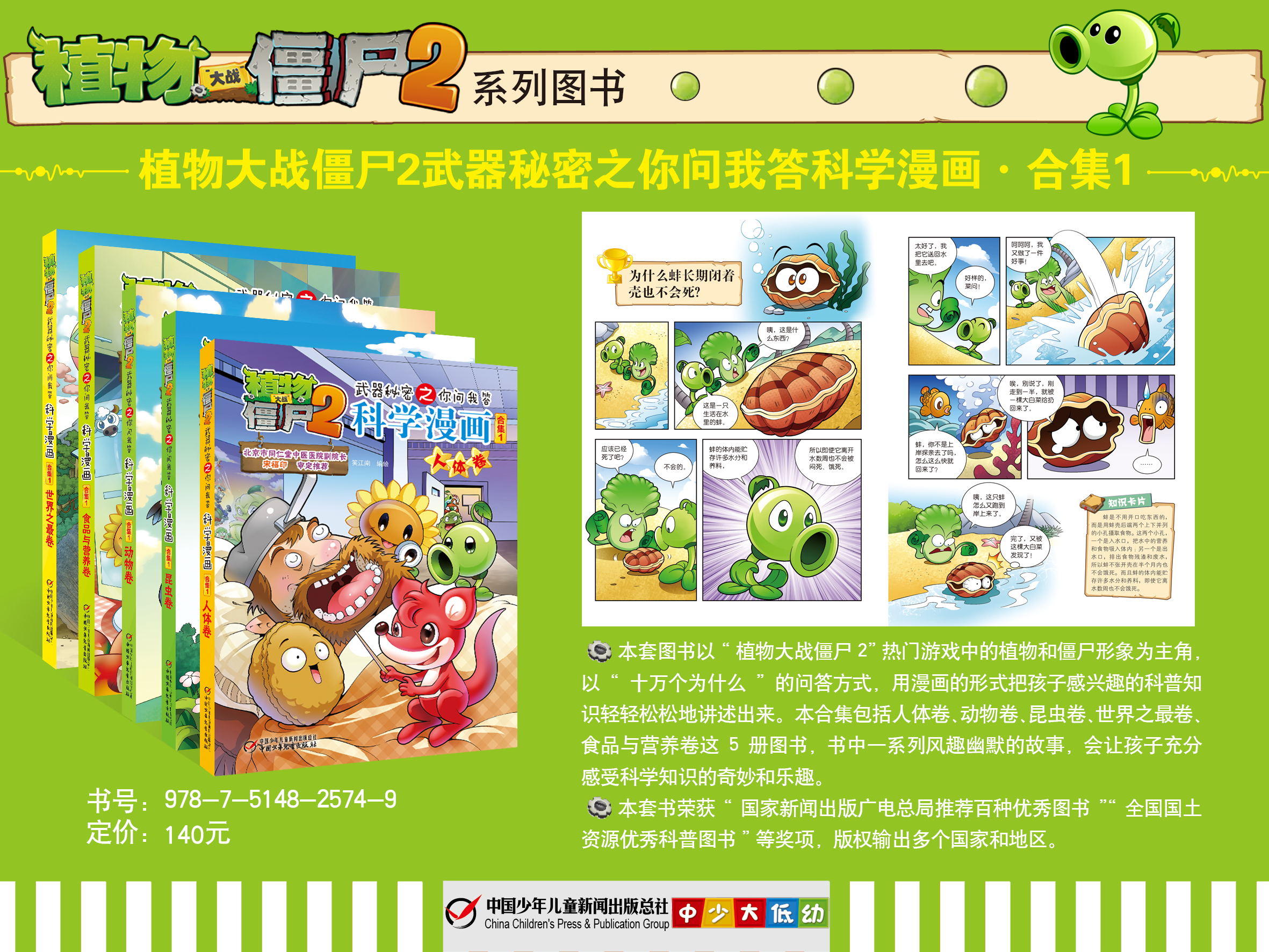 本套图书以“植物大战僵尸2”热门游戏中的植物和僵尸形象为主角,以十万个为什么的问答方式,用漫画的形式把孩子感兴趣的科普知识轻轻松松地讲述出来。