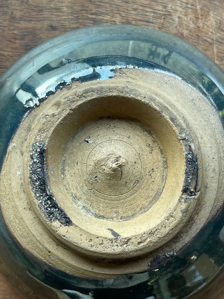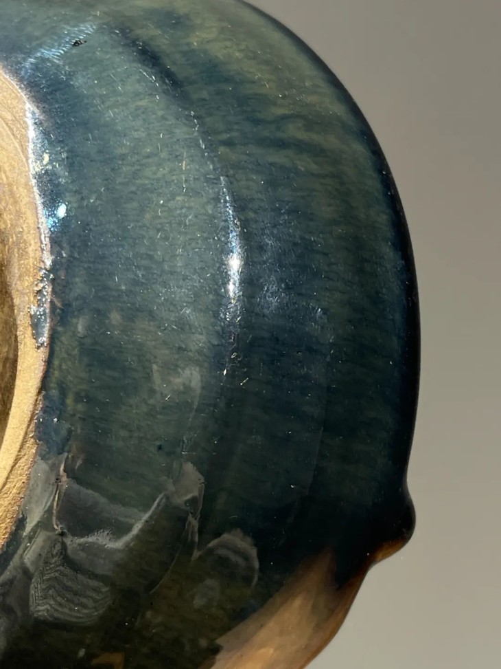 这是一件造型简约典雅,线条流畅,覆盖高玻化琉璃蓝釉的佛钵形香炉,此手持尺寸的佛钵形碗,造型优雅简约,除矮圈足与碗内套烧环无釉露胎外,覆盖玻化强半通透琉璃蓝釉,釉色深遽典雅,质地坚硬油亮,口沿因覆烧而形成凝聚的釉珠,整体风格独特豪迈,应是江西景德镇地区的小窑所烧造的茶碗或是佛前供钵。所谓霁蓝釉与霁红釉一样,是景德镇元代开始风行的高温釉,以昂贵用于画青花瓷的钴蓝料为呈色剂,由于材料贵重,高温烧造废品率高,因此是当是造价极昂贵的瓷器品类。此霁藍琉璃釉钵形碗,如图所示,圈足与碗内套烧环上有黏釉斑,以及釉面正常使用磨痕外保存完好,整体釉面玻璃光泽鲜艳亮丽,无其它损伤。尺寸:碗口直径:12厘米,底部直径:5.8厘米,高:5.5厘米,重量:275.6克。