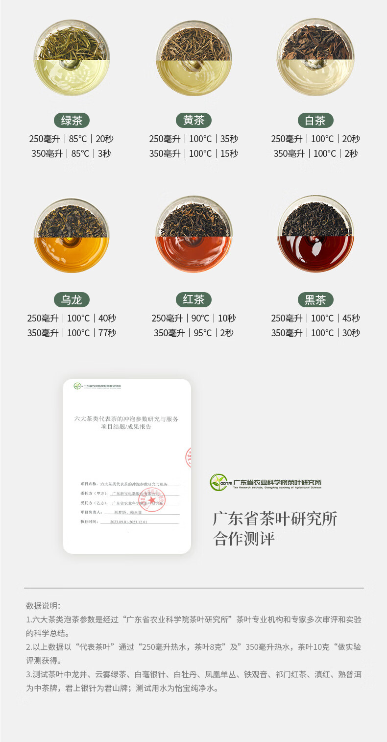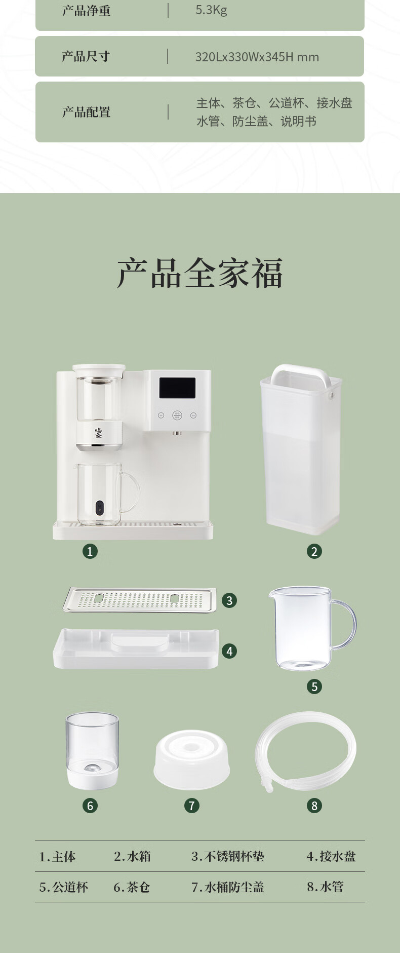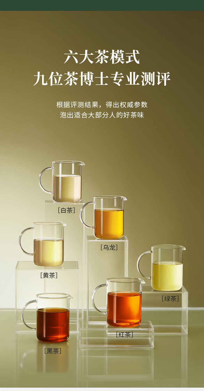 材质:304不锈钢,高硼硅玻璃,PCTG,ABS,PP 标准配件:主机、茶仓、公道杯、接水盘、接水管、防尘盖、说明书