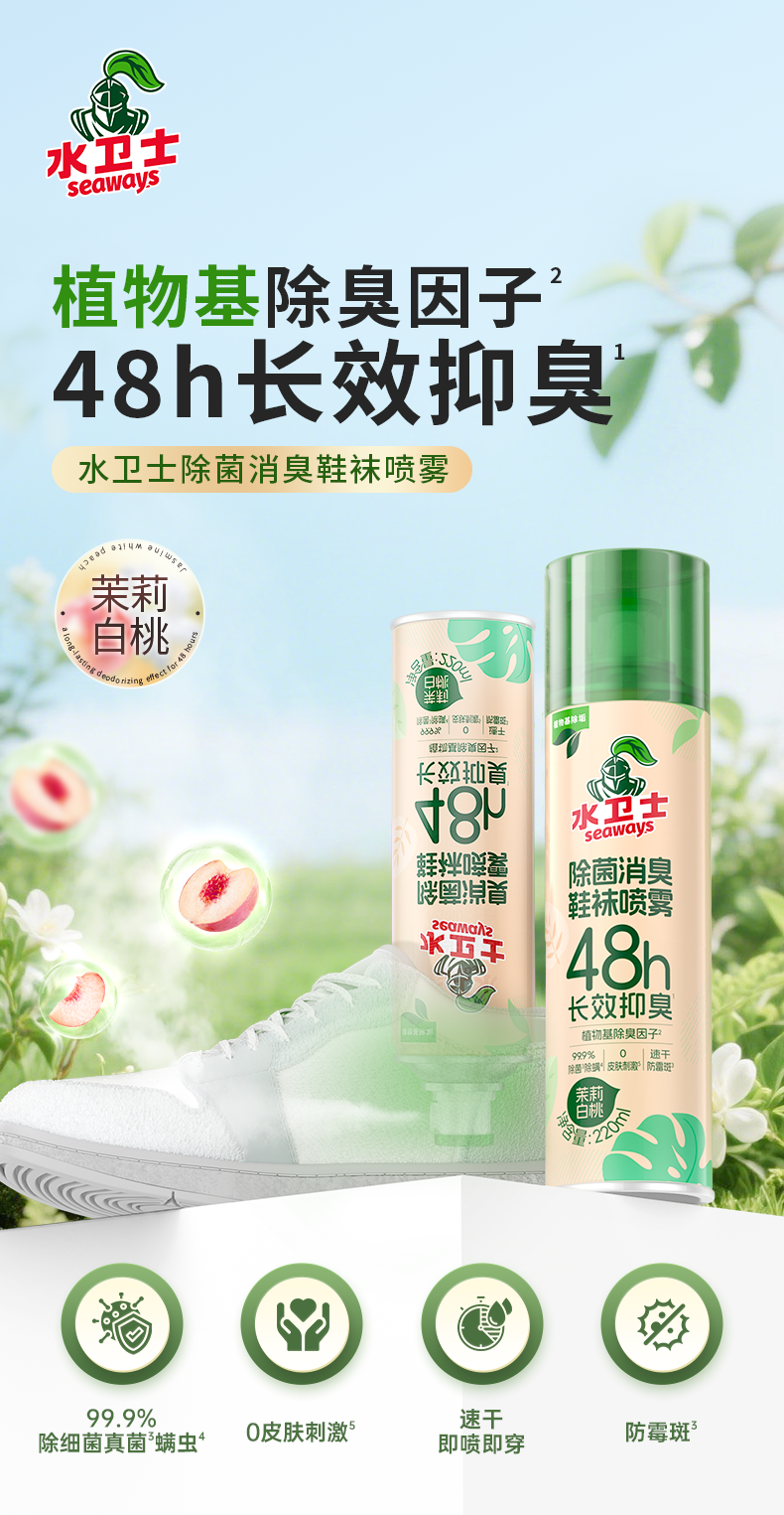 夏季不尴尬,鞋袜香喷喷!【超值4瓶装】“明星同款”水卫士 除菌消臭鞋袜喷雾 植物基48h长效抑臭 220ml*4瓶