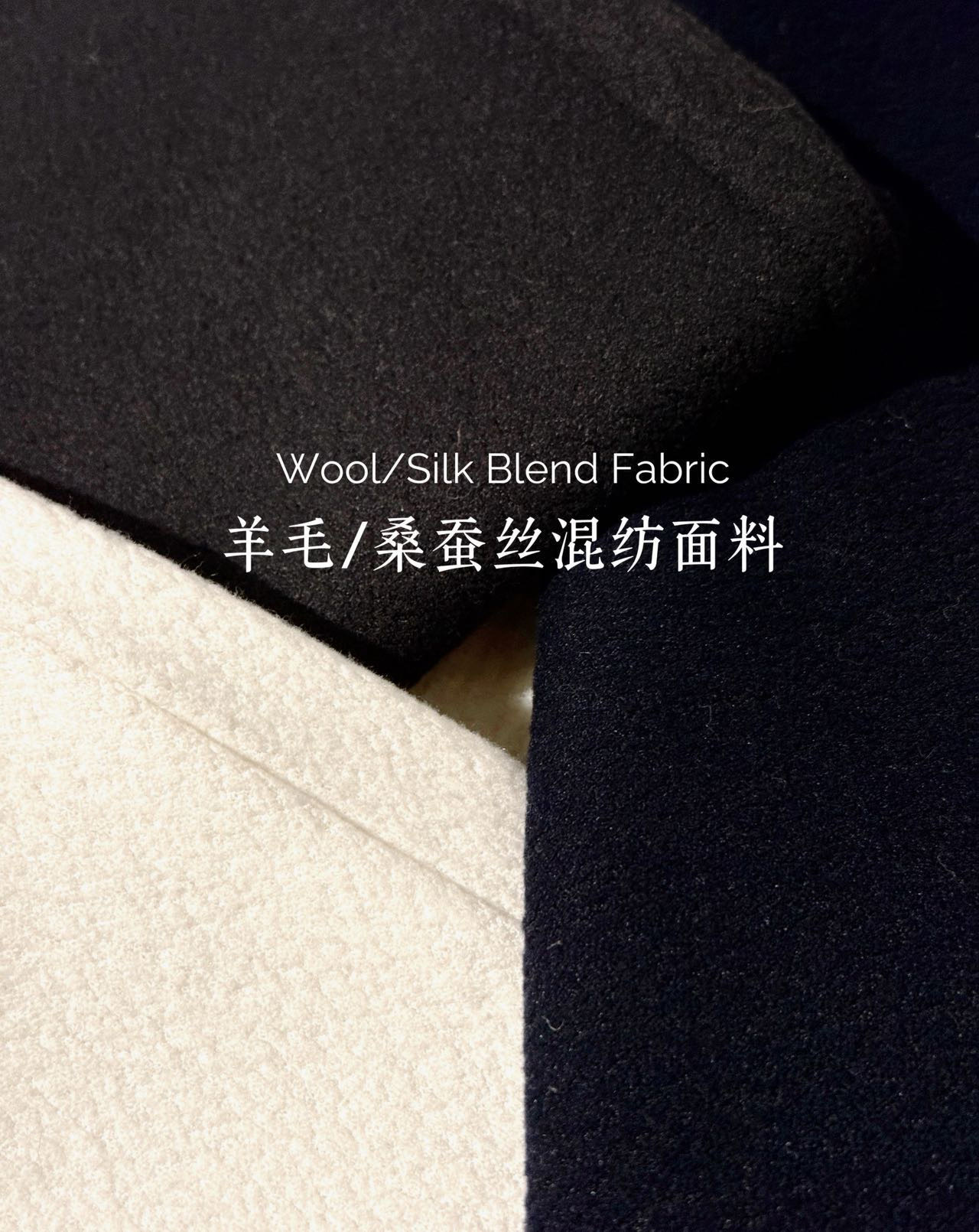这款面料是保暖与质感的优质结合由 1.1%的羊毛、1.1%的桑蚕丝以及其他纤维混纺而成!
