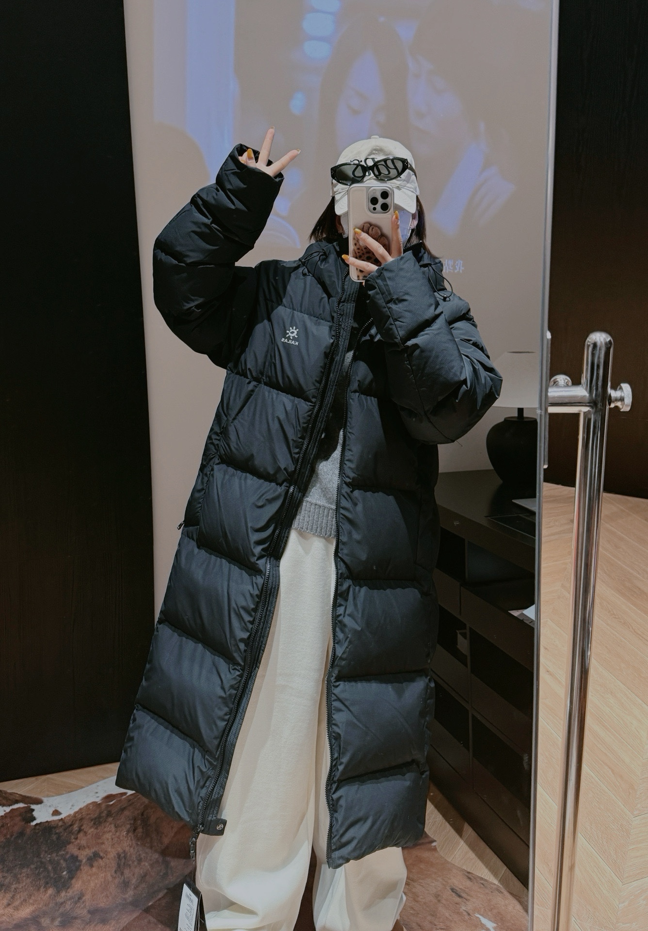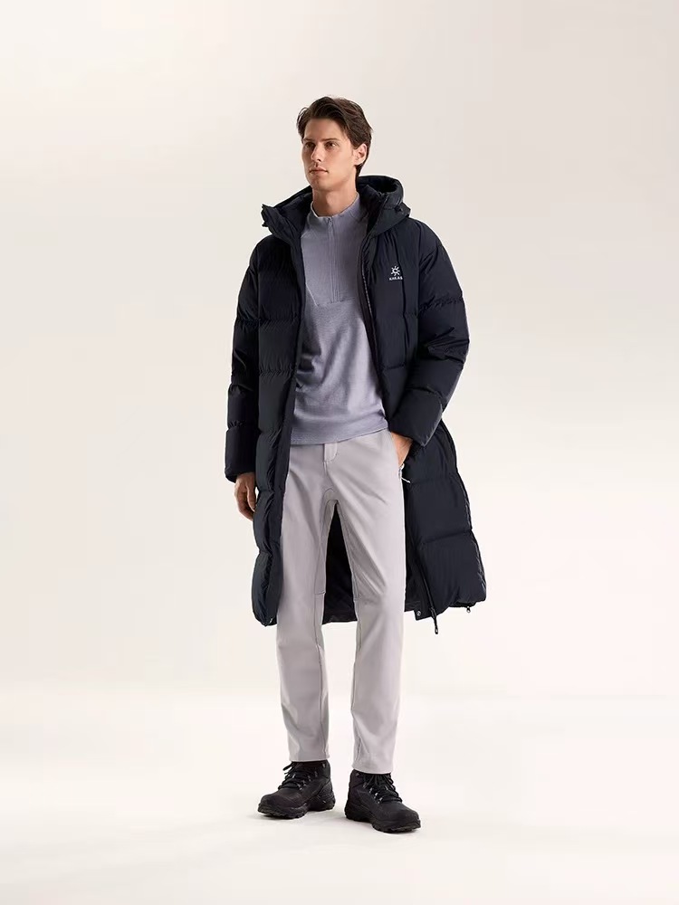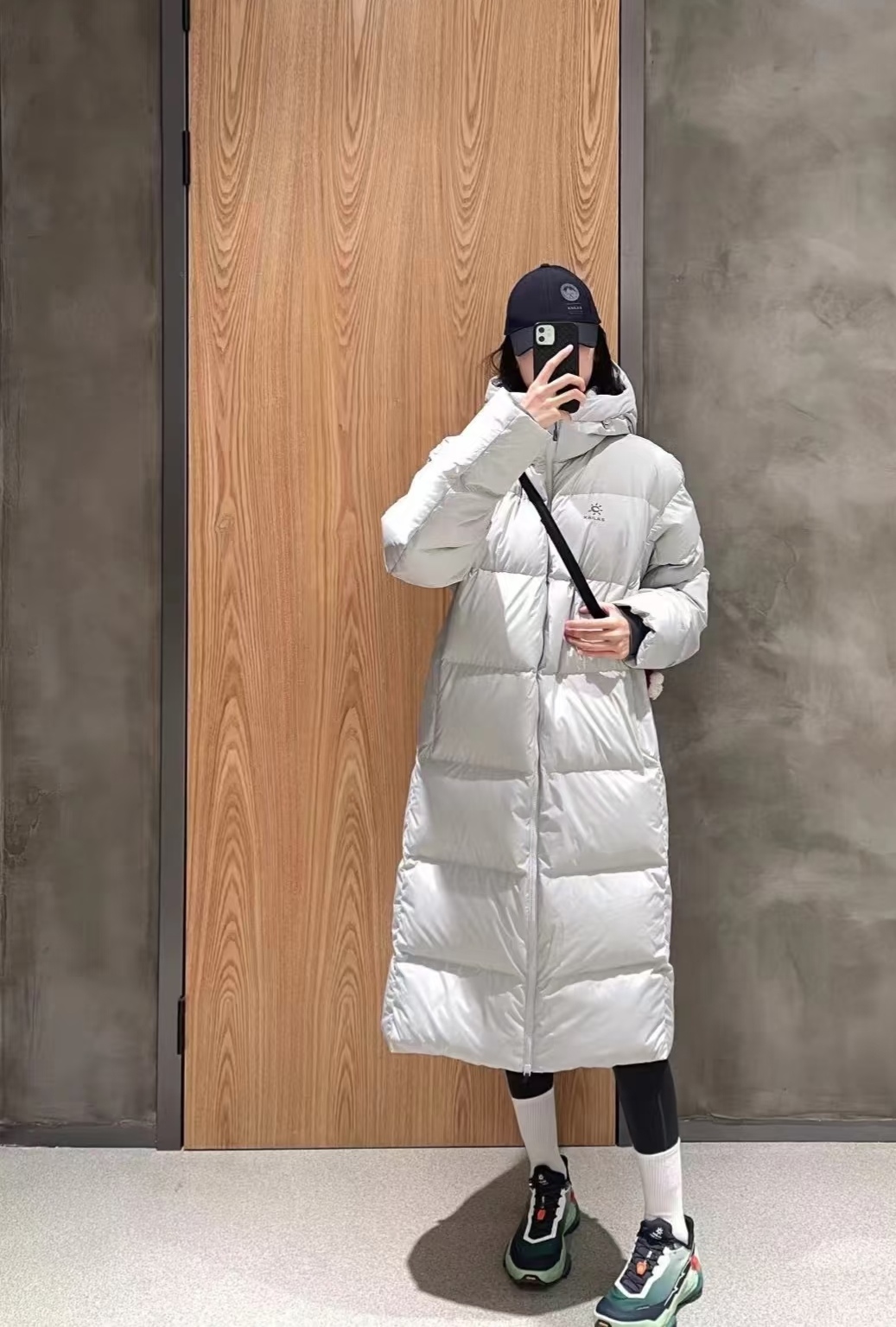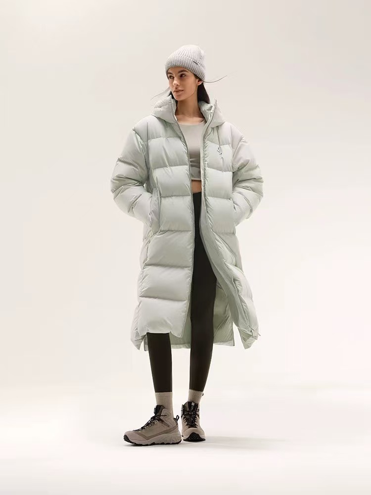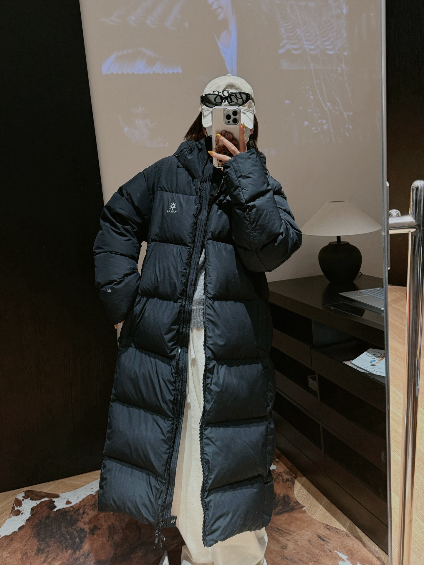 内里填充高蓬鹅绒,尽管是长款但也丝毫没有笨重的感觉,版型也相当贴心利落,侧边拉链开衩的设计让你可以大步阔走~