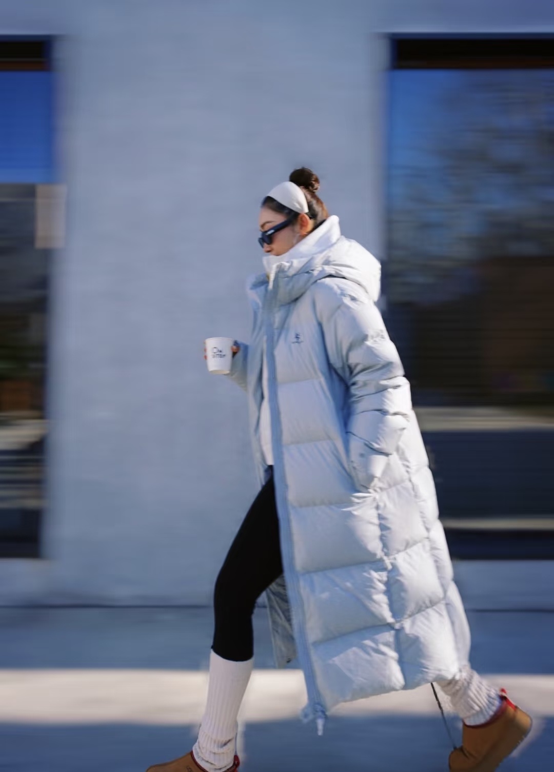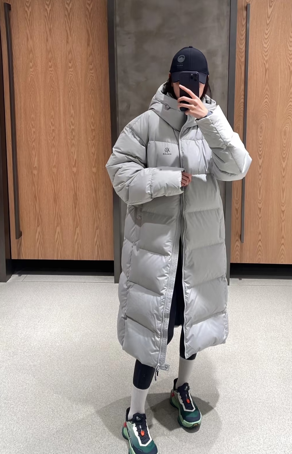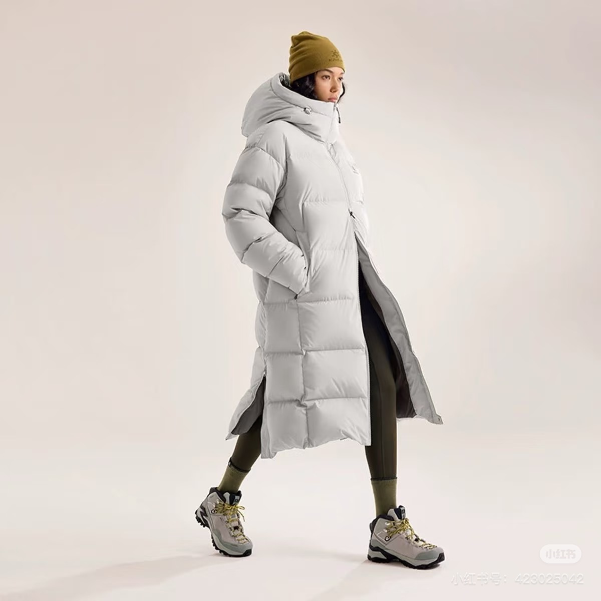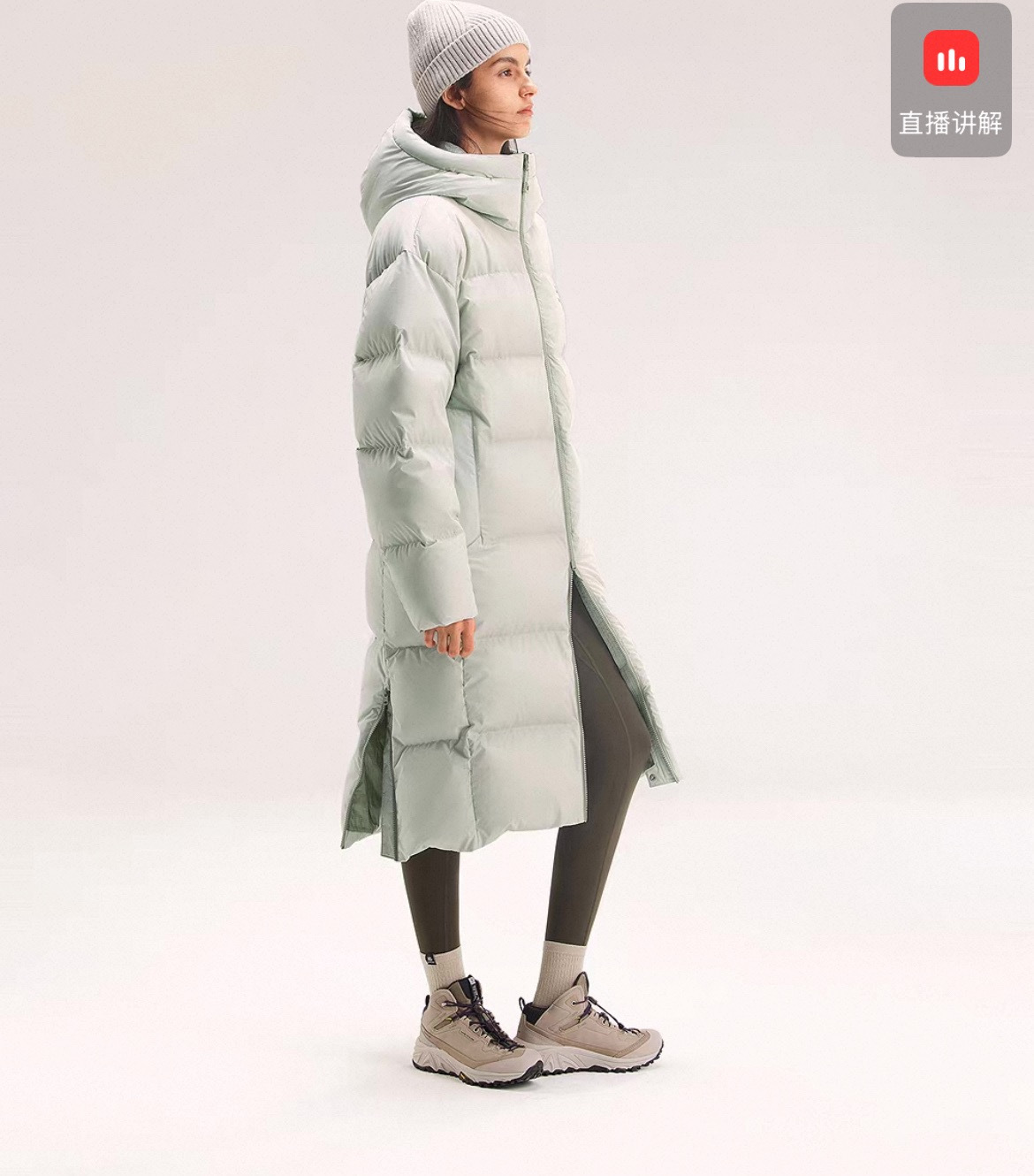 内里填充高蓬鹅绒,尽管是长款但也丝毫没有笨重的感觉,版型也相当贴心利落,侧边拉链开衩的设计让你可以大步阔走~