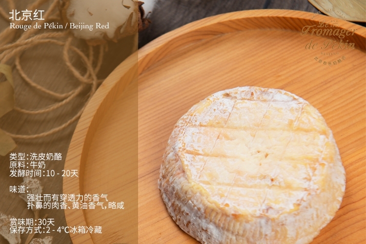 北京红属于水洗皮软质奶酪,这款洗皮软质奶酪有四种,分别用红酒、中国白酒、啤酒和盐水洗皮。四款颜色不同,味道也不同。红酒洗皮的颜色是深紫色,用白酒和盐水浸洗的表皮橙色,用啤酒洗则是成黄褐色。