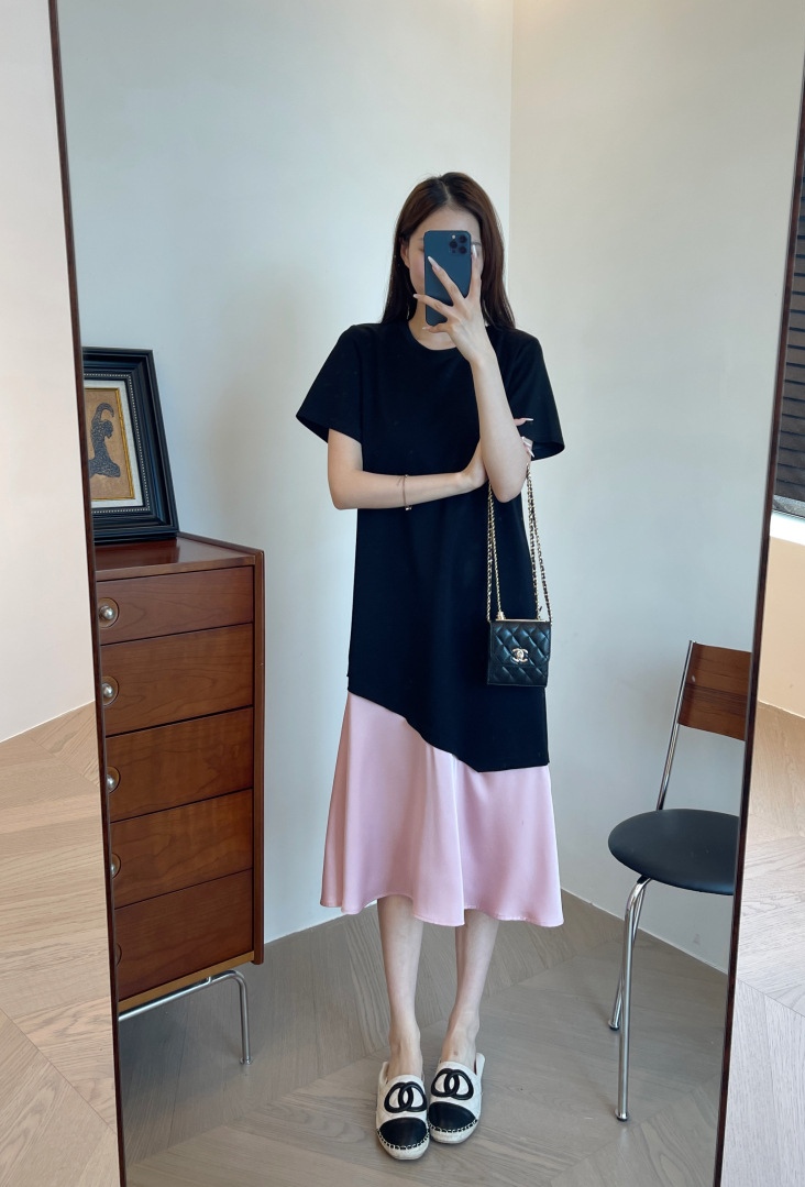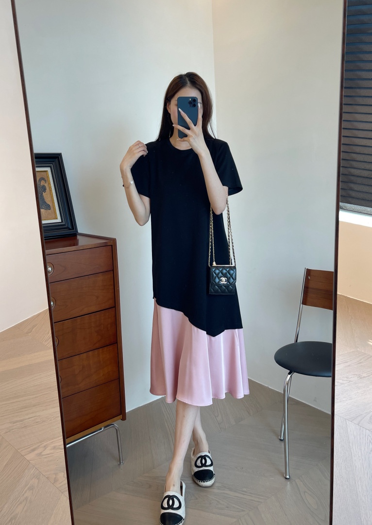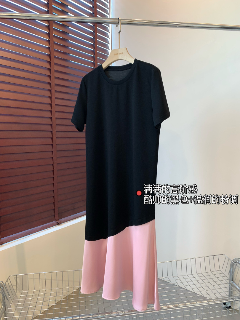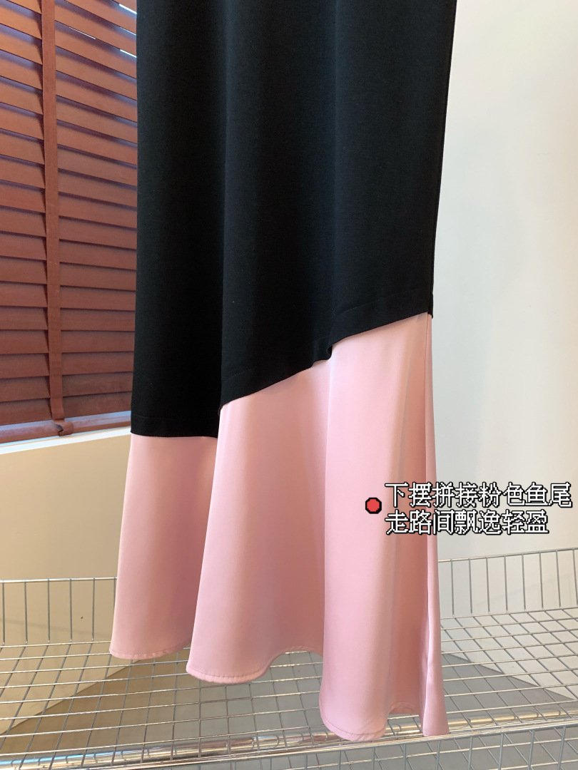 这个面料也是今年新研发的,保持垂坠感的同时,又清凉透气,很适合夏季去穿。可以遮手臂、遮肚子、遮大腿的版型,穿上一整个放飞自我。出门吃得再饱都没关系。确实,这个版型刚上身试的时候就很惊艳,竟然可以瘦得那么过分,直筒版型不修身,对于腰部有肉肉的朋友也莞全不用担心。下摆拼接粉色鱼尾,走路间飘逸轻盈,选用了更轻盈的聚酸料,丝滑又有光泽感,让一件黑色的连衣裙穿出灵动感面料好打理,久穿不易皱!
