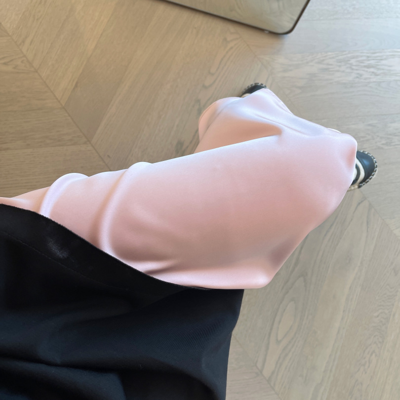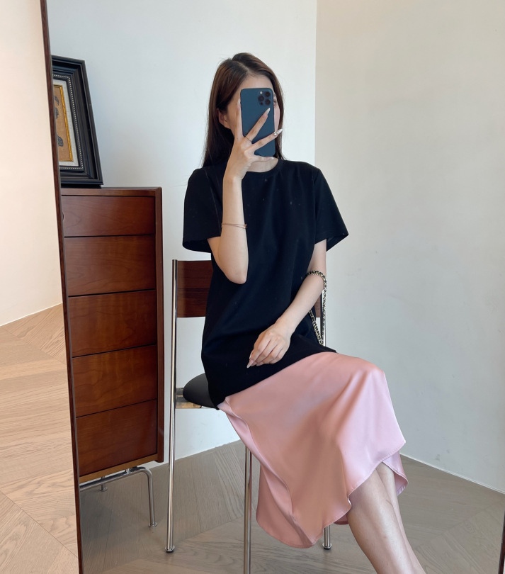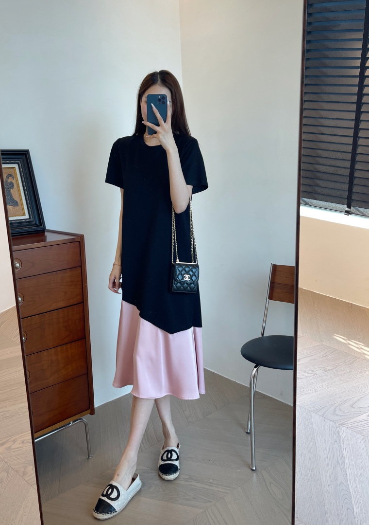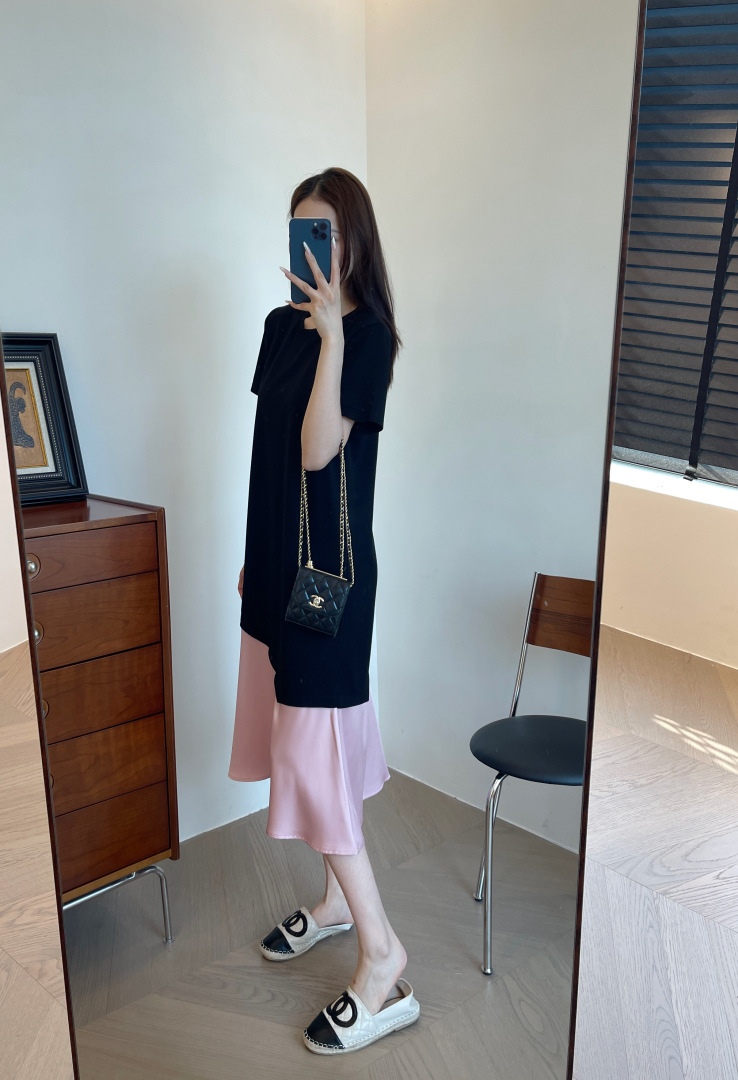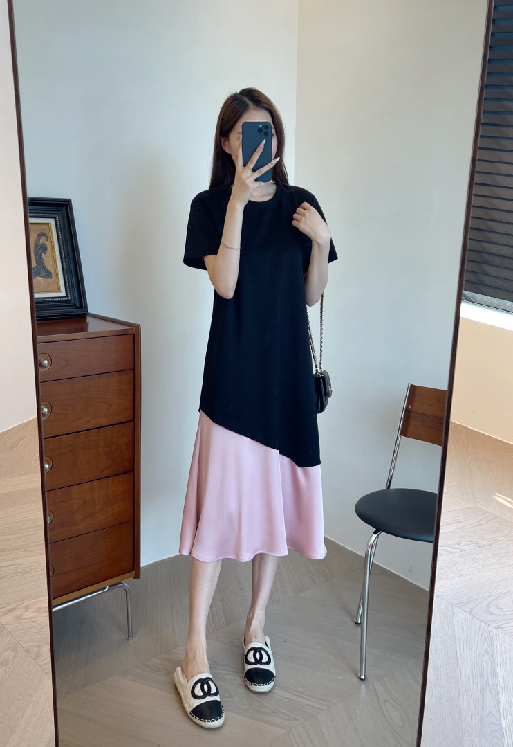 这个面料也是今年新研发的,保持垂坠感的同时,又清凉透气,很适合夏季去穿。可以遮手臂、遮肚子、遮大腿的版型,穿上一整个放飞自我。出门吃得再饱都没关系。确实,这个版型刚上身试的时候就很惊艳,竟然可以瘦得那么过分,直筒版型不修身,对于腰部有肉肉的朋友也莞全不用担心。下摆拼接粉色鱼尾,走路间飘逸轻盈,选用了更轻盈的聚酸料,丝滑又有光泽感,让一件黑色的连衣裙穿出灵动感面料好打理,久穿不易皱!