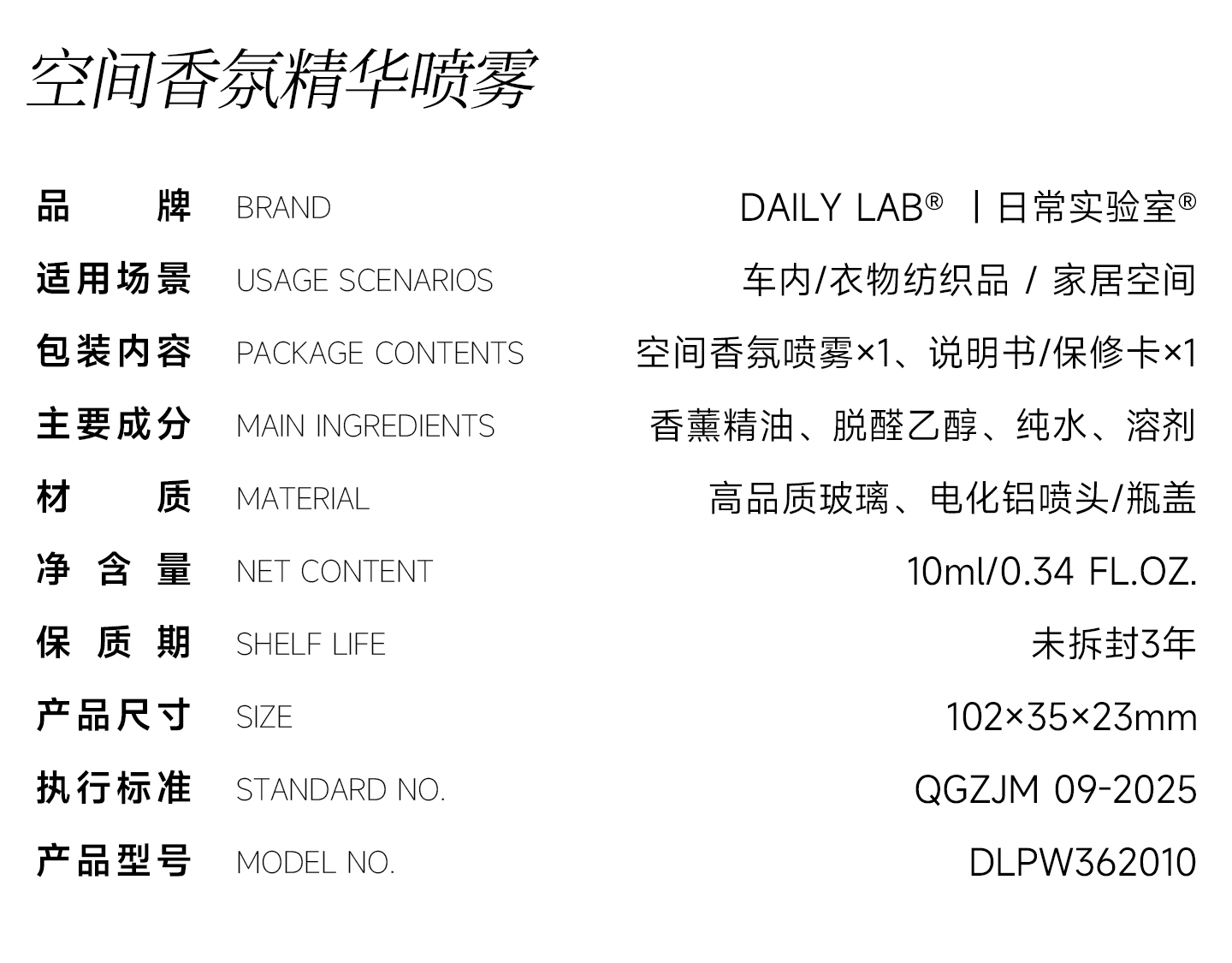 【新品】DAILY LAB 浓香水喷雾空间香薰喷雾车载香水