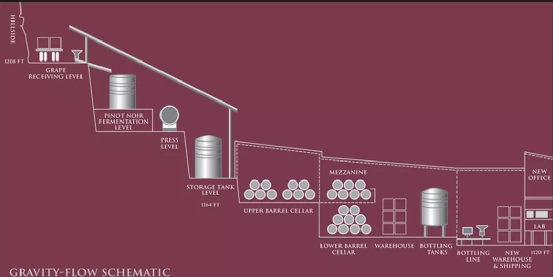 不是说这种方法不行,只是在这个过程中,来自水泵的外力和操作的限制,无可避免地会对葡萄酒的质量造成一定的影响,如风味物质流失、接触空气造成氧化等。所以一些名庄为了更好的保护葡萄,会开始考虑更温柔的重力法。利用重力原理,让葡萄汁、葡萄酒等液体从上一个酿酒环节的容器里自然地流到下一环节的容器里的酿酒方法。