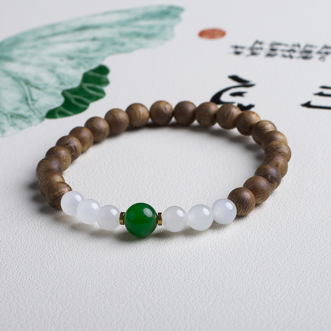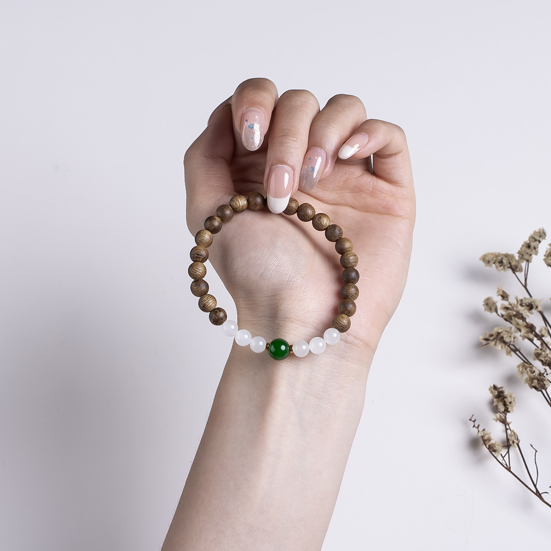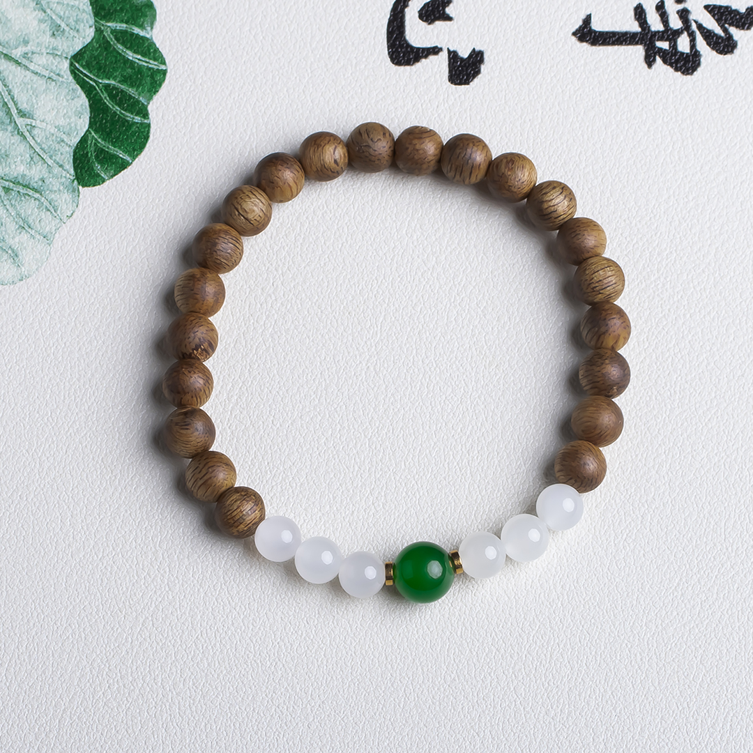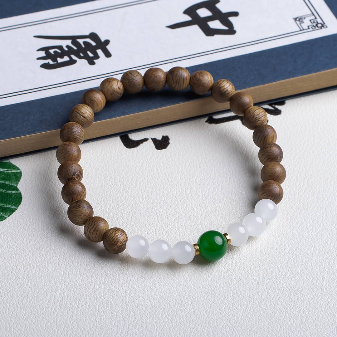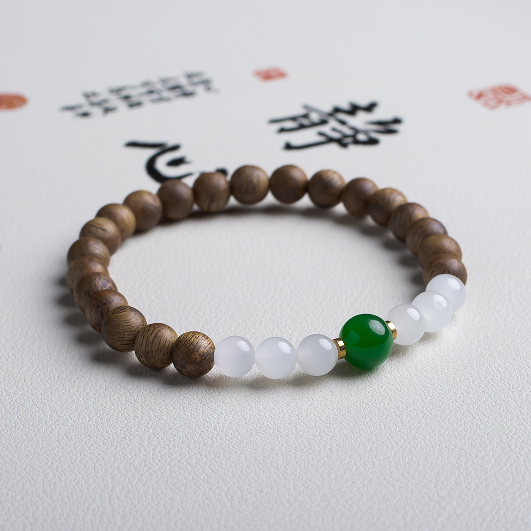 xy0471沉香+白玉碧玉国风手串.银,天然沉香约6.3mm,原色原味,香味自然清甜,六颗脂白无瑕的白玉,一颗满色肉的碧玉,国风款式,时尚典雅,上手大方百搭,养颜养身。