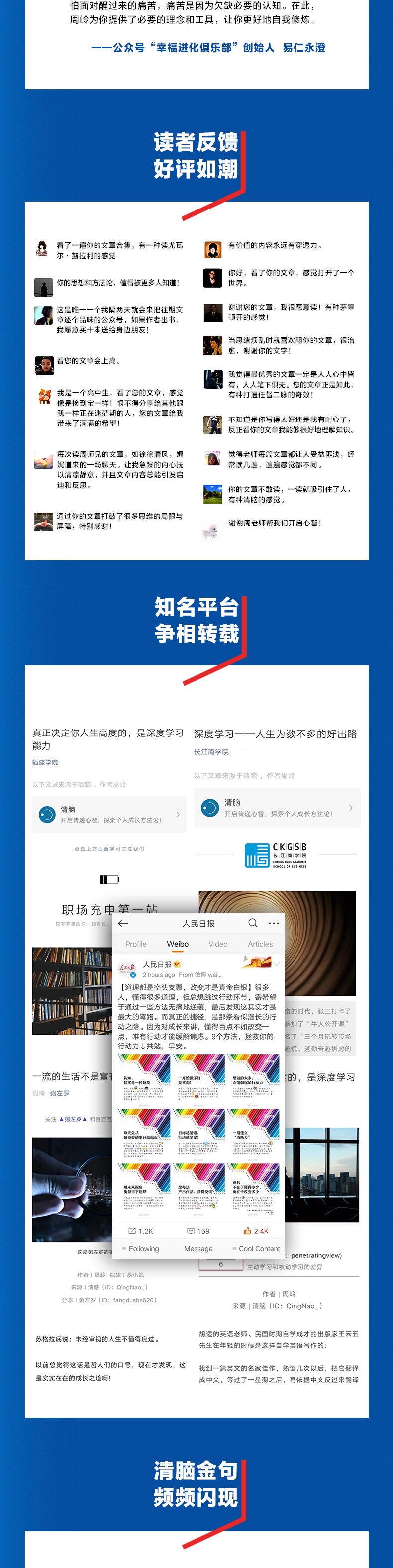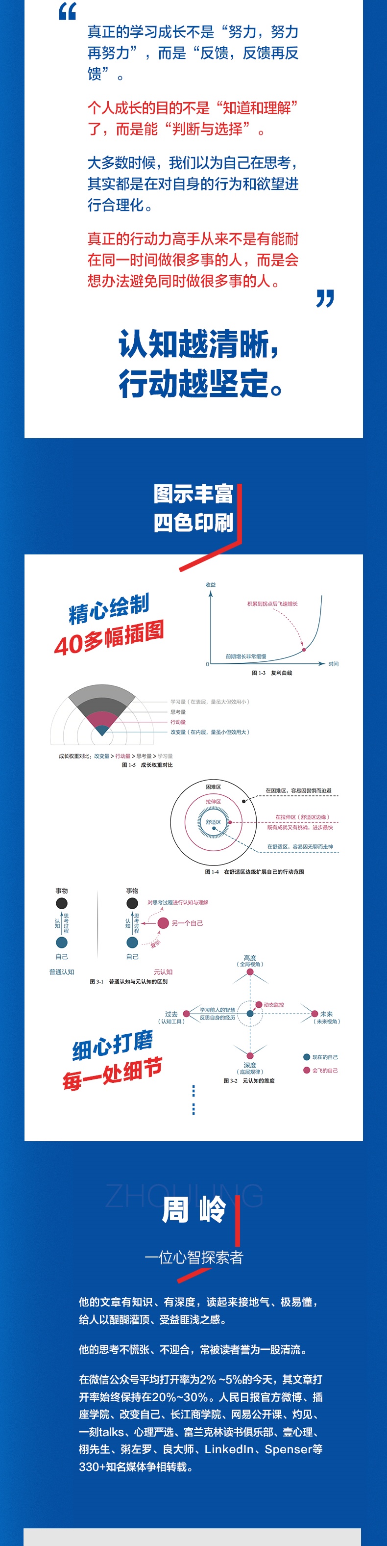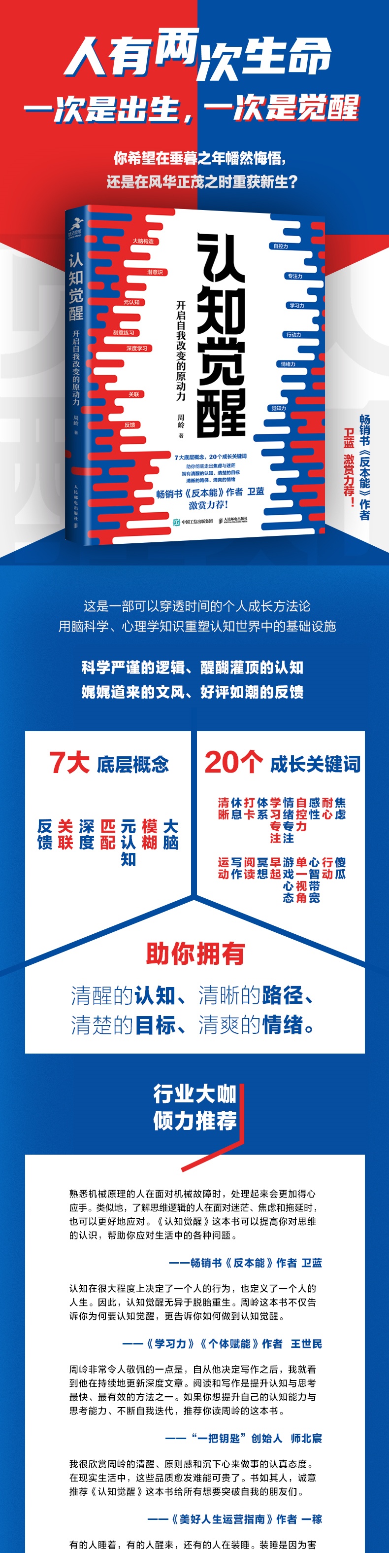 《认知觉醒:开启自我改变的原动力》 周岭:一位心智探索者 他的文章有知识、有深度,读起来接地气、极易懂,给人以醍醐灌顶、受益匪浅之感。 他的思考不慌张、不迎合,常被读者誉为一股清流。在**平均打开率为2% ~5%的*,其文章打开率始终保持在20% ~30%。其文章还被“人民日报”官方微博等多家媒体争相转载。 *:清脑 (科学严谨的逻辑、醍醐灌顶的认知、娓娓道来的文风、好评如潮的反馈) 《认知驱动:做成一件对他人很有用的事》 周岭 一位心智探索者。 他的文章有知识、有深度,读起来接地气、极易懂,给人以醍醐灌顶、受益匪浅之感。 他的思考不慌张、不迎合,常被读者誉为一股清流。 其文章打开率始终保持在20%~30%。其文章还被 “人民日报”官方微博等多家媒体争相转载。 著有《认知觉醒》,年发行突破15万册。(数据来自品牌方内部系统) 科学严谨的逻辑 醍醐灌顶的认知 娓娓道来的文风 好评如潮的反馈 当一个人能觉醒, 还能走向创造(价值)之路时, 他一定是幸福的, *少不会迷茫和痛苦。 《认知觉醒:伴随一生的学习方法论(青少年学习版)》 周岭 一位心智探索者。 其探索实践的学习成长方法论,不仅科学严谨,深入底层,而且通俗易懂,直击痛点,给人醍醐灌顶、受益匪浅之感,广受学生、老师和家长读者的欢迎。其文章还被人民日报官方微博等多家媒体争相转载。 著有《认知觉醒:开启自我改变的原动力》《认知驱动:做成一件对他人很有用的事》。