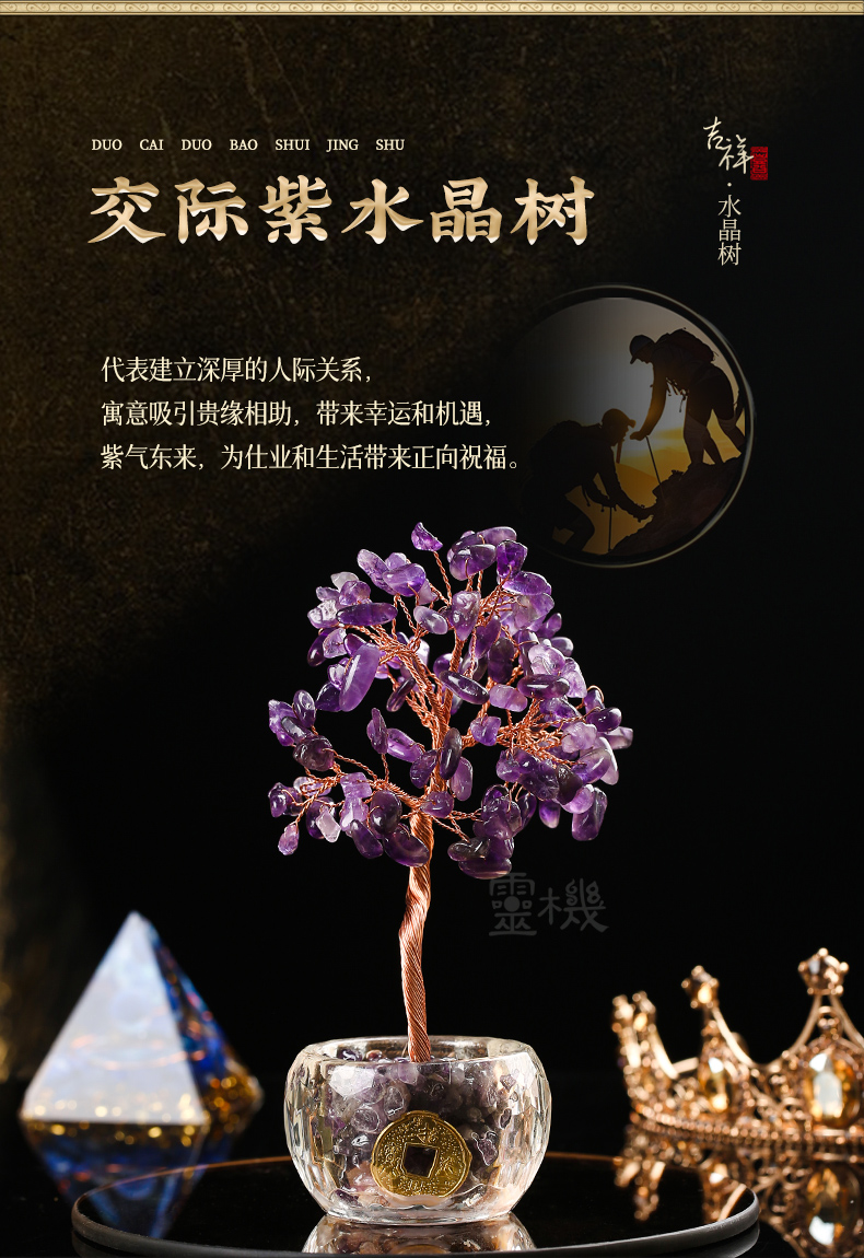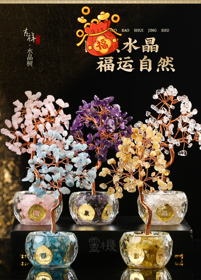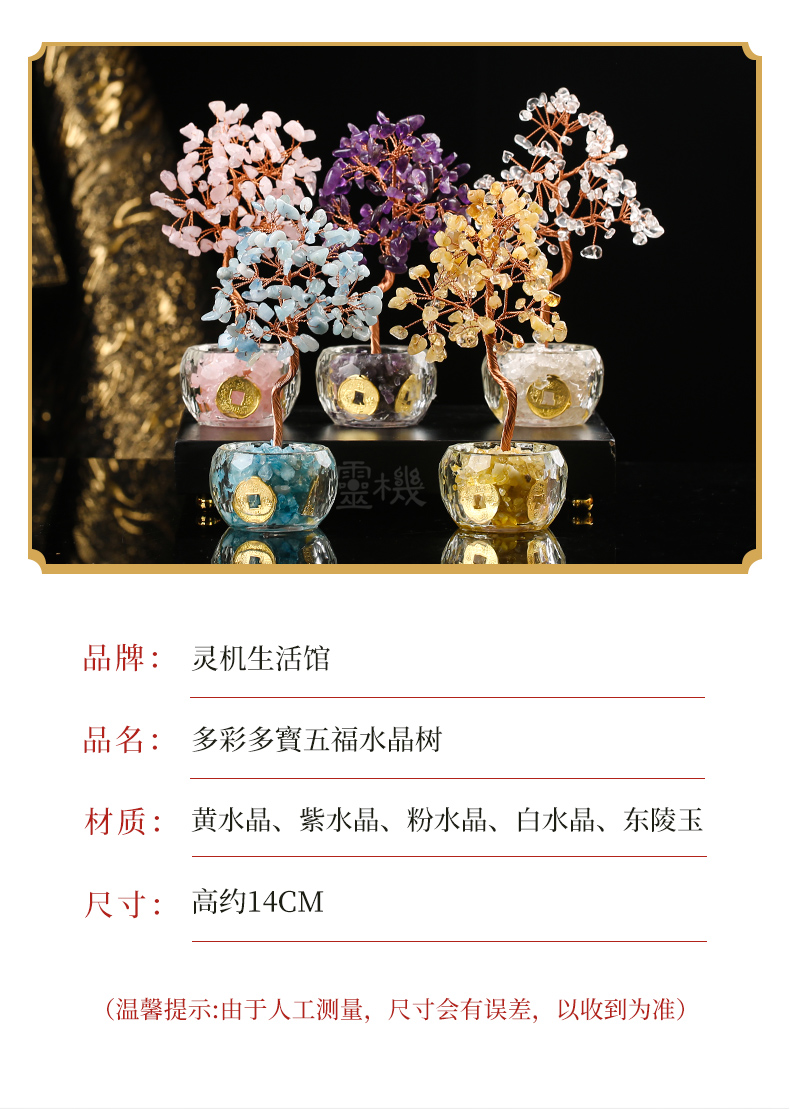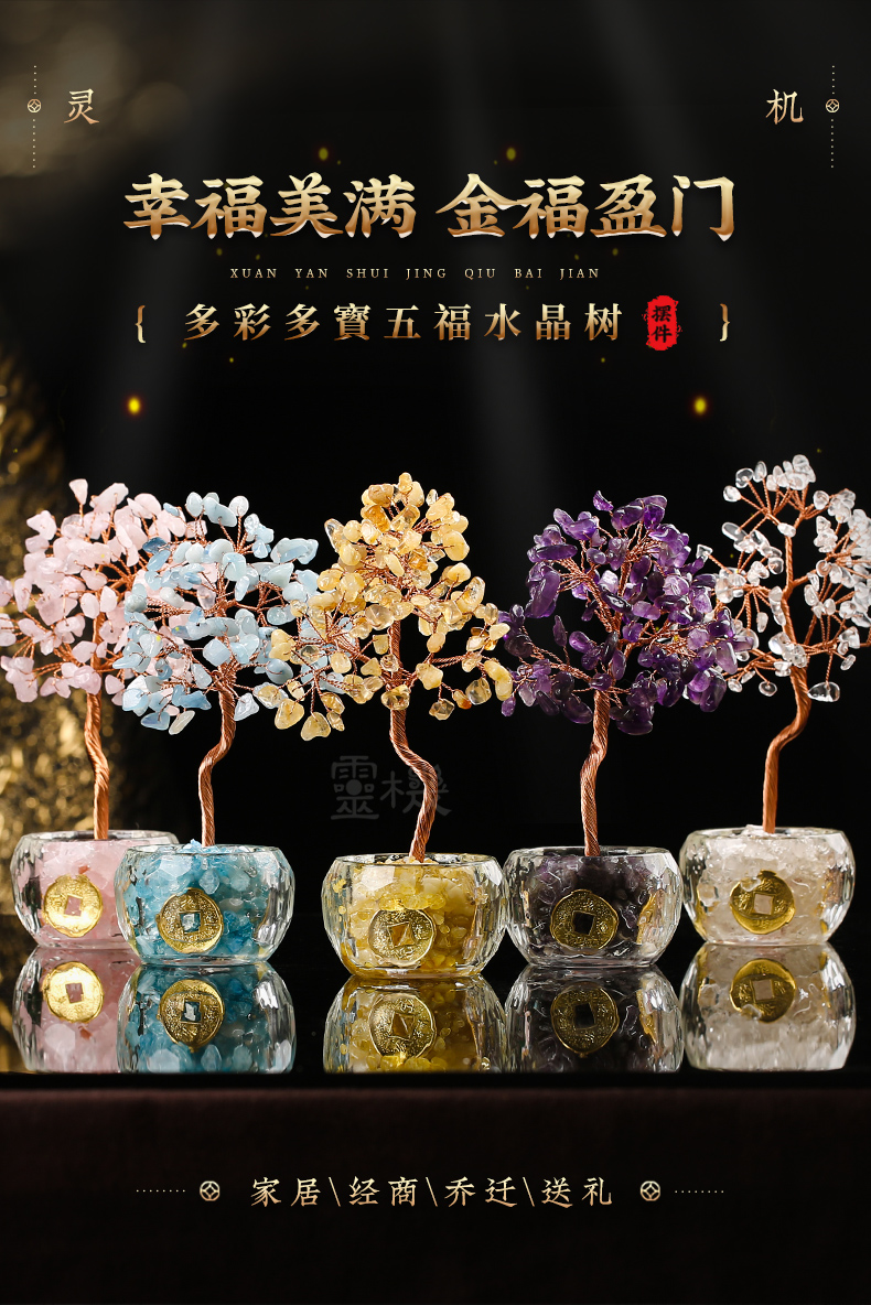 【灵机吉品多彩多寳五福水晶树吉祥水晶家居办公室前台摆件装饰品