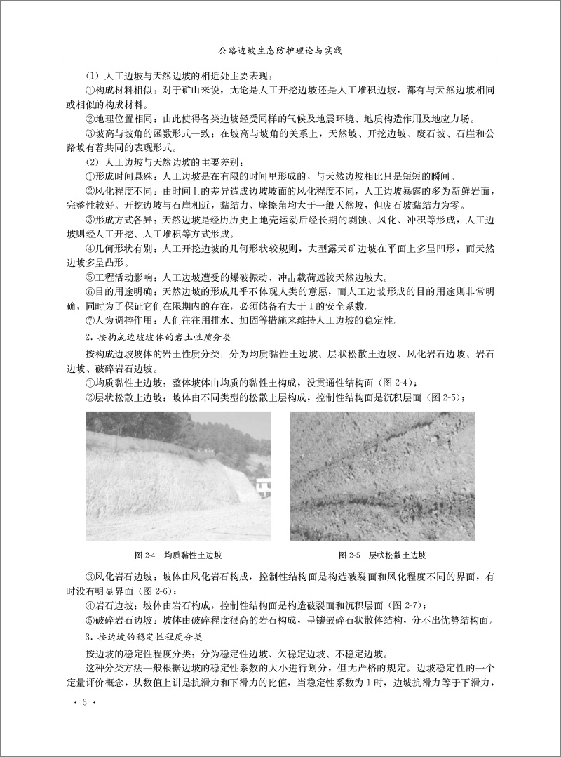 本书将植物学和生态学等理论应用于边坡的防护技术领域,重点论述了公路边坡分类及病害分析、边坡生态景观评价、边坡生态防护固土理论、人工植草生态防护技术、废旧轮胎护坡技术、液压喷播边坡防护技术、三维土工网边坡防护技术、土工格栅与土工网复合防护技术、生态袋防护技术、石笼生态箱防护技术、圬工骨架植草防护技术、生态混凝土边坡防护技术、行栽香根草防护技术、新型边坡防户技术、公路边坡植物红总植被的选择、防护技术工程实践等内容。