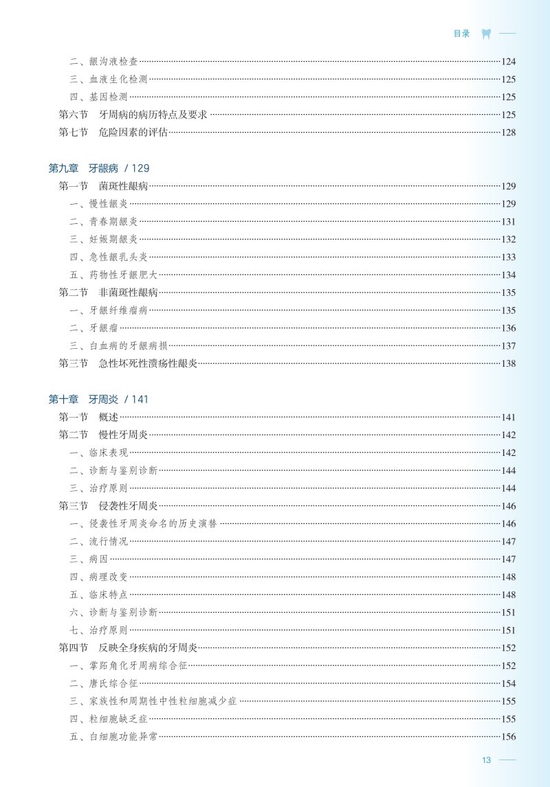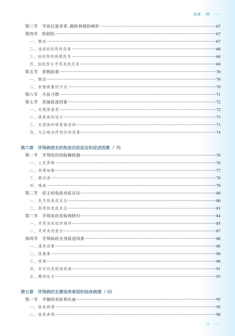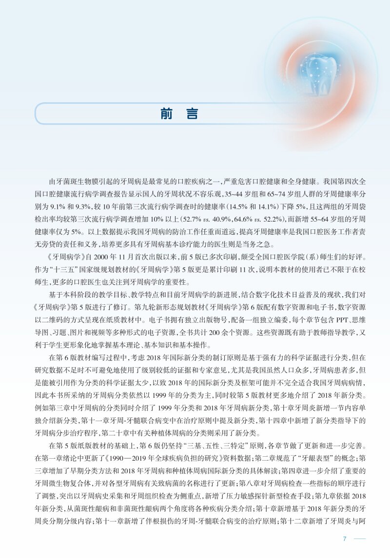 本教材新版不仅延承理论联系实际、严谨求实的传统,以介绍基本理论、基本概念、基础知识和基本操作技术为主,而且适当增加牙周病学研究的新进展、新观点和临床的新技术、新方法;每章增加了提要和思考题,并配有网络增值服务。本书第一章补充了我国现代牙周病学的发展史;第二章增加前牙美学区的临床特点供临床治疗时参考;第十二章补充对系统性疾病患者的治疗注意事项和特点;鉴于危险因素评估在牙周治疗计划中的重要作用逐渐提高,而且应该成为每一名牙病和牙周病患者综合评估的一部分,本版将第十三章拆分新增为第十三章临床危险因素评估和预后与第十四章牙周病的治疗计划两章。因呼气异味(口臭)而到口腔门诊就诊求治的患者日益增多,第十一章特意新增呼气异味一节,介绍呼气异味的来源、诊断和处理原则。第二十章新增牙周病患者的种植治疗,特别强调牙周病患者种植治疗的预后和风险、种植治疗前的准备、治疗特点及种植治疗后的评估和维护,以期牙周病患者能得到规范化的牙周和种植修复治疗,减少种植体的感染、提高远期疗效。