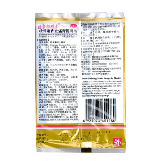 陪都 壮骨麝香止痛膏4片活血止痛风湿关节肌肉痛扭伤