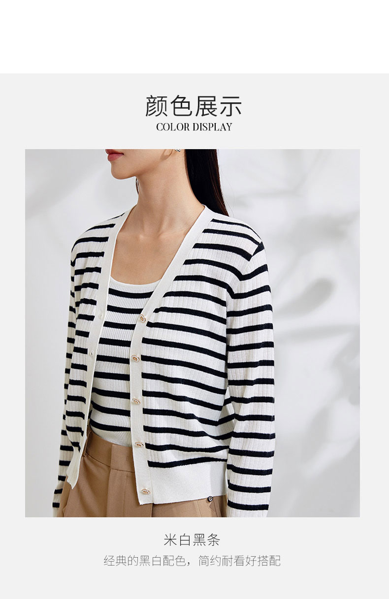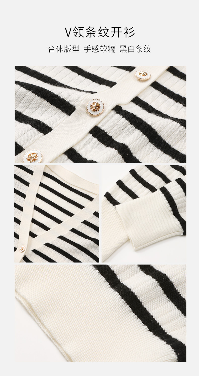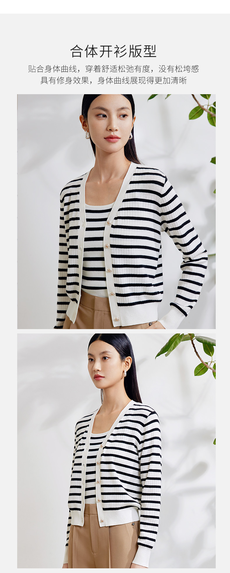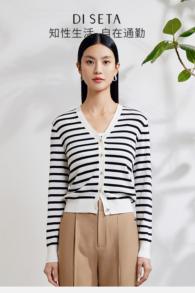 玳莎V领条纹针织开衫女时尚百搭显瘦羊毛上衣外套 EA33301