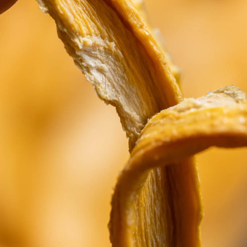 芒果干色泽金黄,质地弹牙,几乎没有丝,味道甜中带酸,甜度完全都是芒果自身树上成熟以后的香甜,香气腹郁,让人垂涎三尺。
