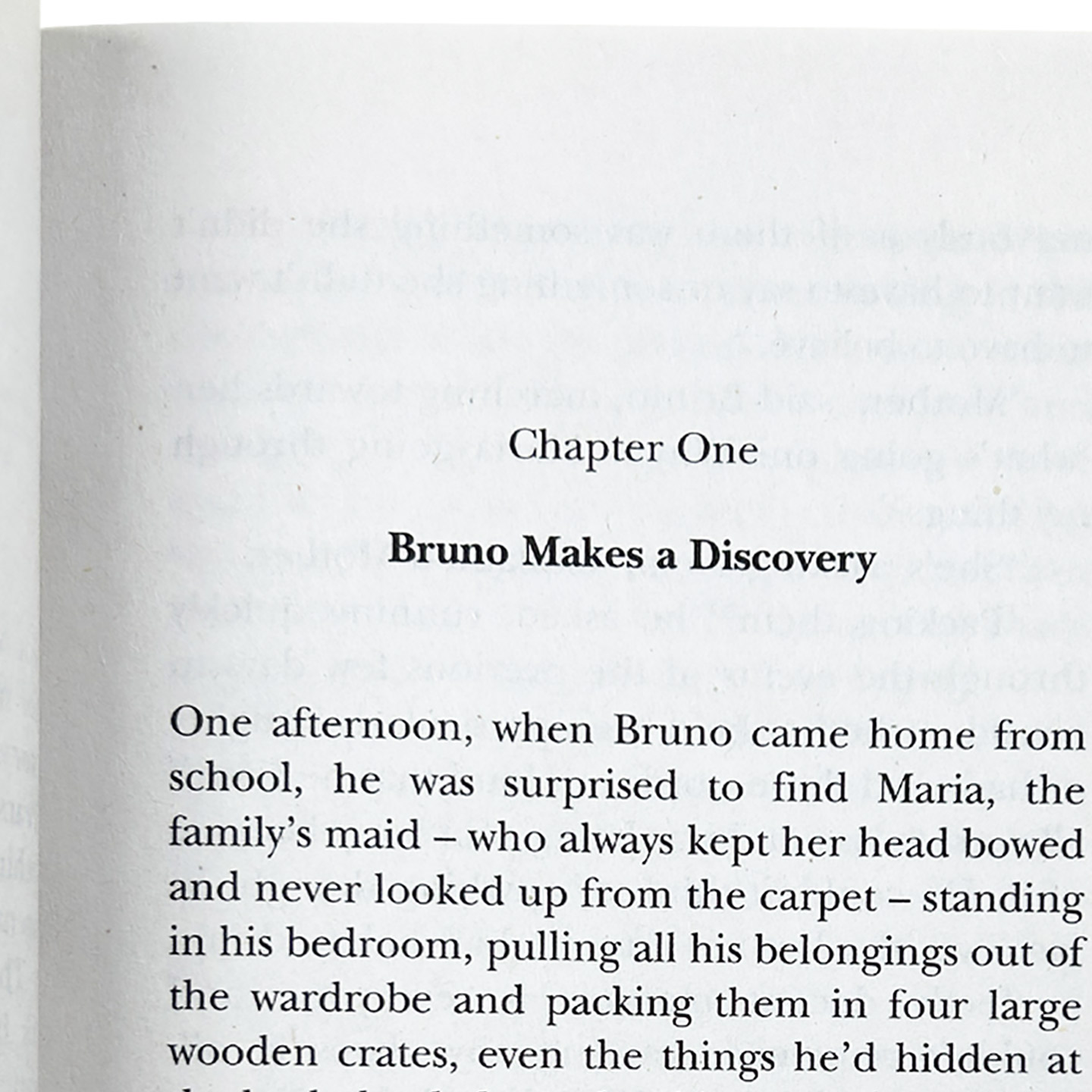 One afternoon, when Bruno came home from school, he was surprised to find Maria, the family’s maid— who always kept her head bowed and never looked up from the carpet— standing in his bedroom, pulling all his belongings out of the wardrobe and packing them in four large wooden crates, even the things he’d hidden at the back that belonged to him and were nobody else’s business.