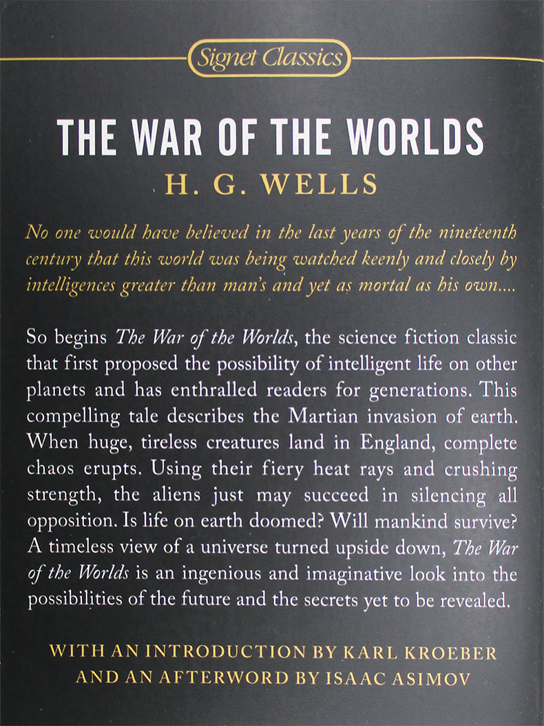 For more than one hundred years H. G. Wells’ classic science fiction tale of the Martian invasion of Earth has enthralled readers with a combination of imagination and incisive commentary on the imbalance of power that continues to be relevant today.No one would have believed in the last years of the nineteenth century that this world was being watched keenly and closely by intelligences greater than man’s and yet as mortal as his own....So begins The War of the Worlds, the science fiction classic that first proposed the possibility of intelligent life on other planets and has enthralled readers for generations. This compelling tale describes the Martian invasion of earth. When huge, tireless creatures land in England, complete chaos erupts. Using their fiery heat rays and crushing strength, the aliens just may succeed in silencing all opposition. Is life on earth doomed? Will mankind survive? A timeless view of a universe turned upside down, The War of the Worlds is an ingenious and imaginative look into the possibilities of the future and the secrets yet to be revealed.WITH AN INTRODUCTION BY KARL KROEBER AND AN AFTERWORD BY ISAAC ASIMOV