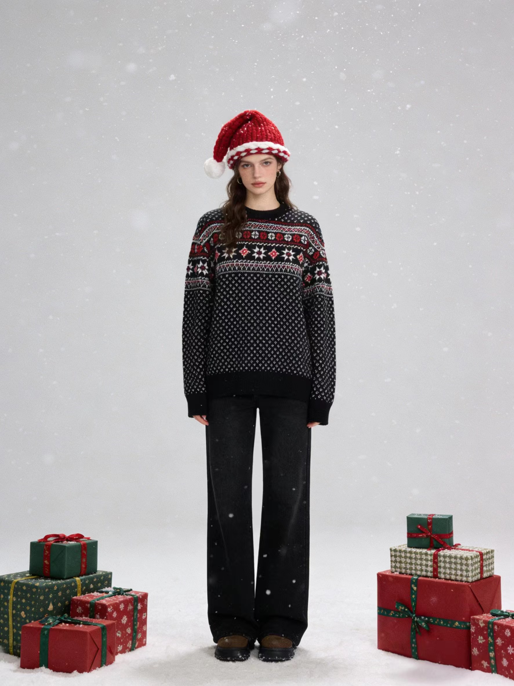 限定秀款羊毛拼色毛衣,新年战袍就位,这件复古提花毛衣直接把氛围感拉满!懂行的人一眼就能看出它的用料诚意——50%羊毛混纺搭配全棉棒针针织,造价不菲的工艺让保暖度和质感双双在线。黑底菱格交织红白提花,北欧风的花纹设计自带复古腔调,宽松的版型对各种身材都超友好。新年走亲访友、出门聚会,单穿内搭都出彩,暖乎乎的上身,气场和温度全拿捏住了~面料炒鸡舒服软糯!含羊毛的版本到底不一样!男女同款,不挑身材不挑人,谁穿谁好看!