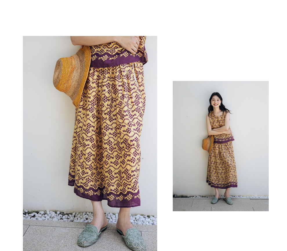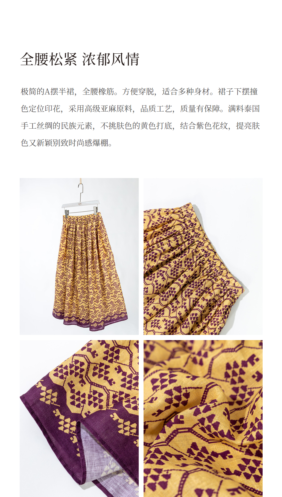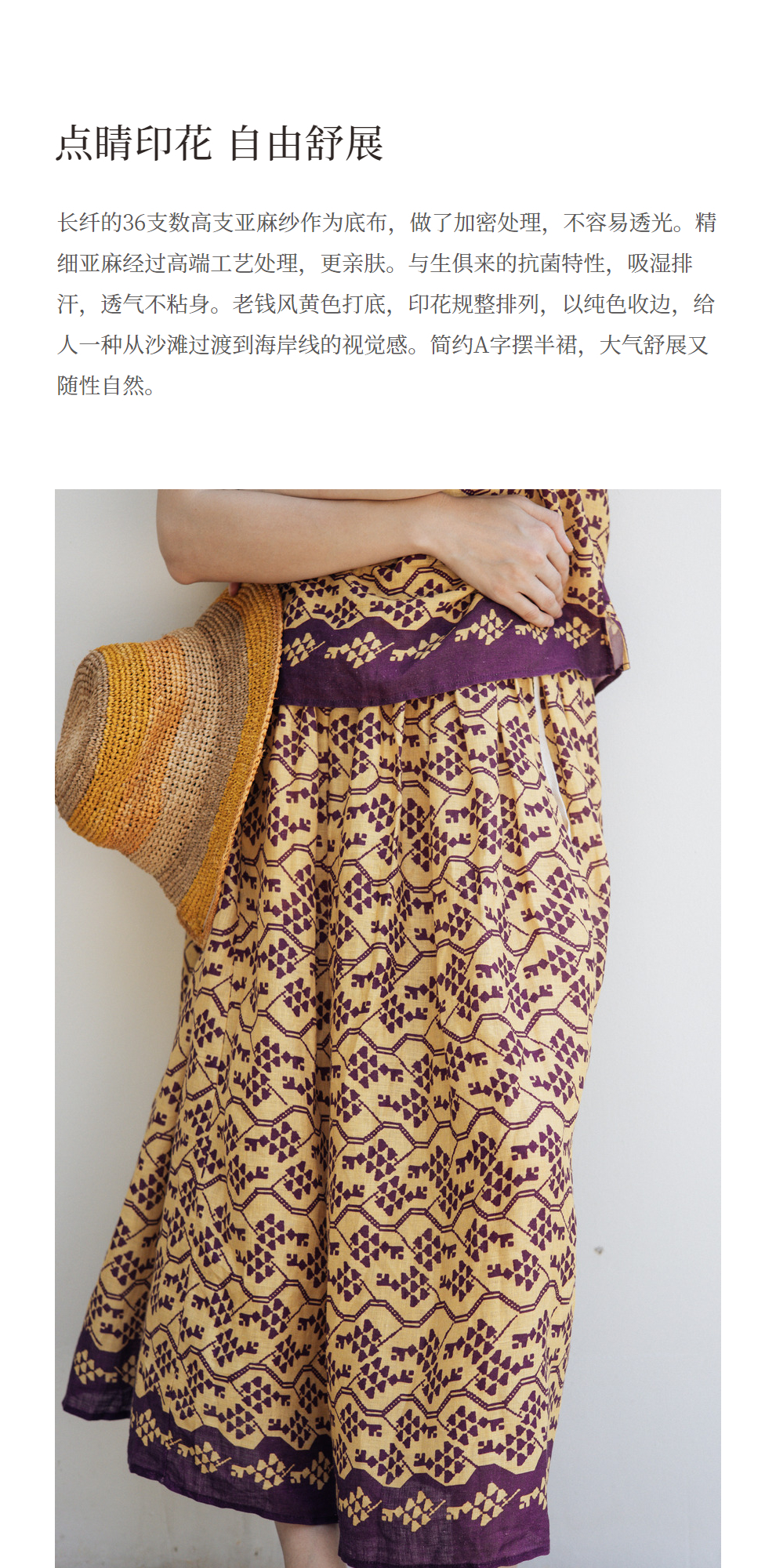 绽放旅行女装358朵/设计感高支亚麻定位印花伞裙旅游度假半身裙