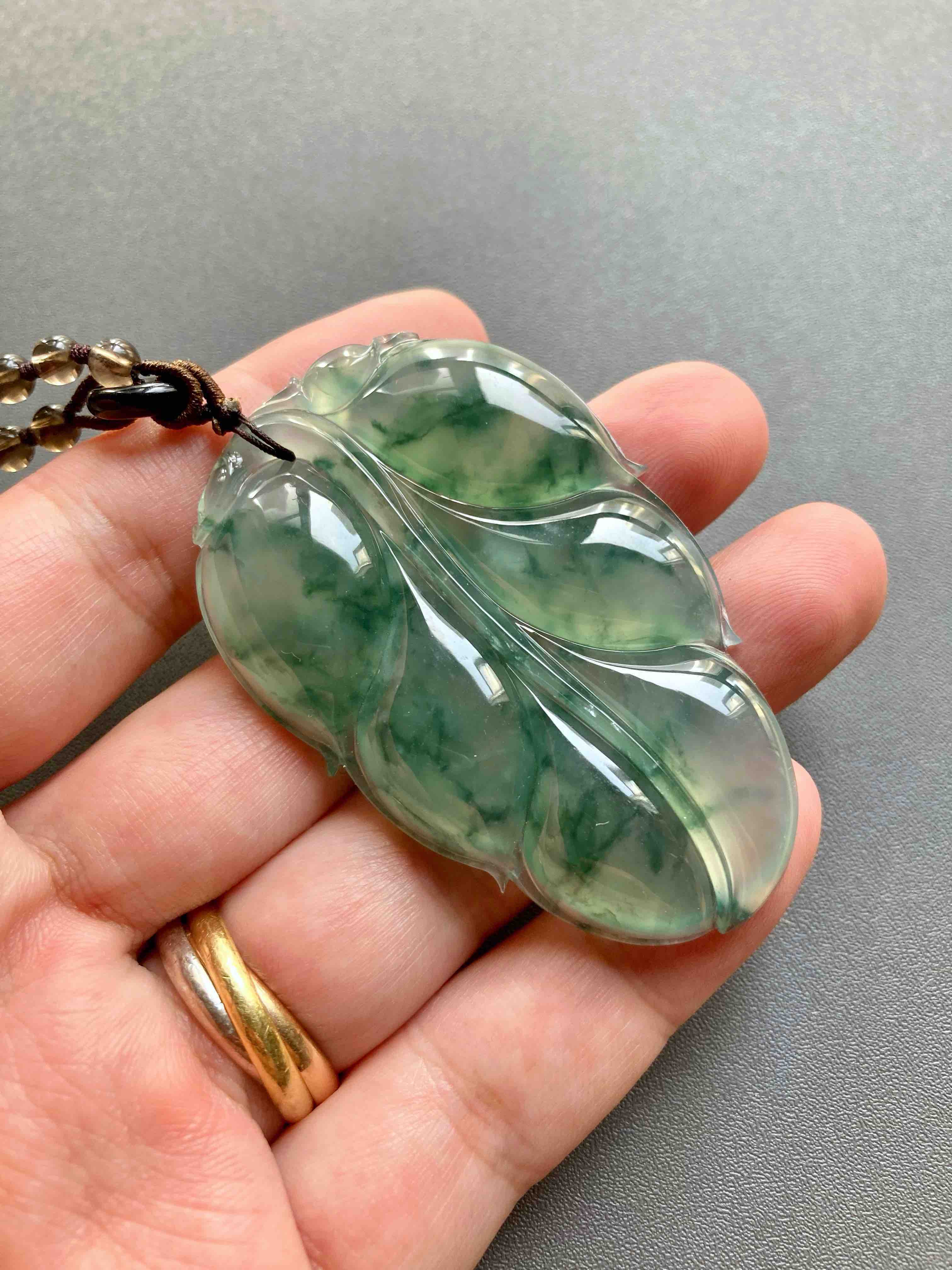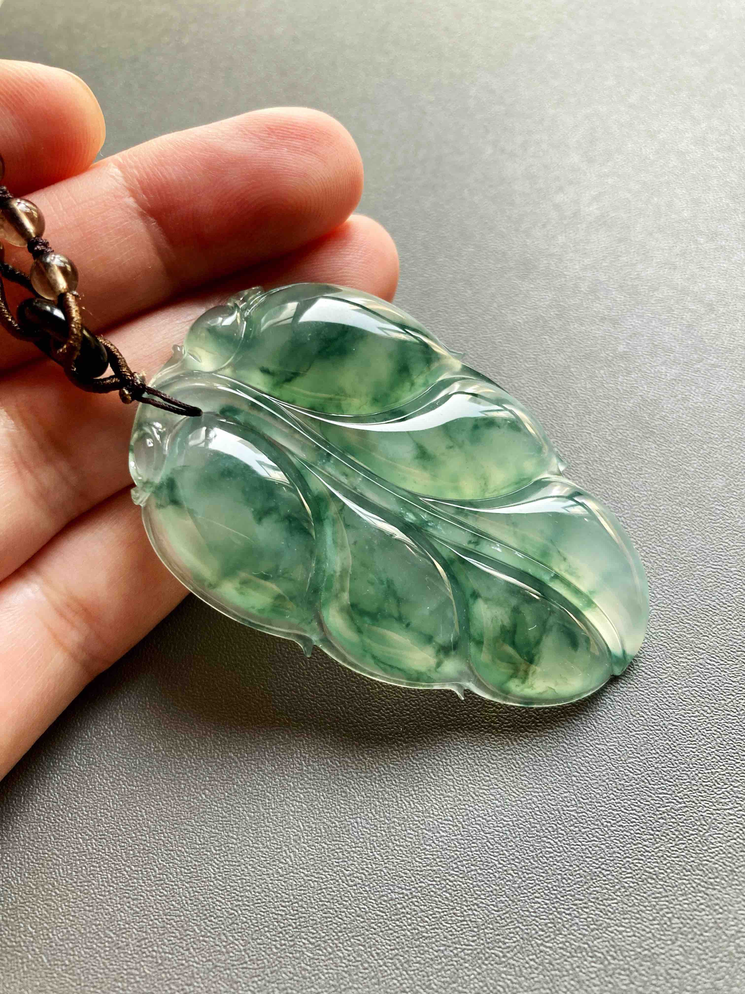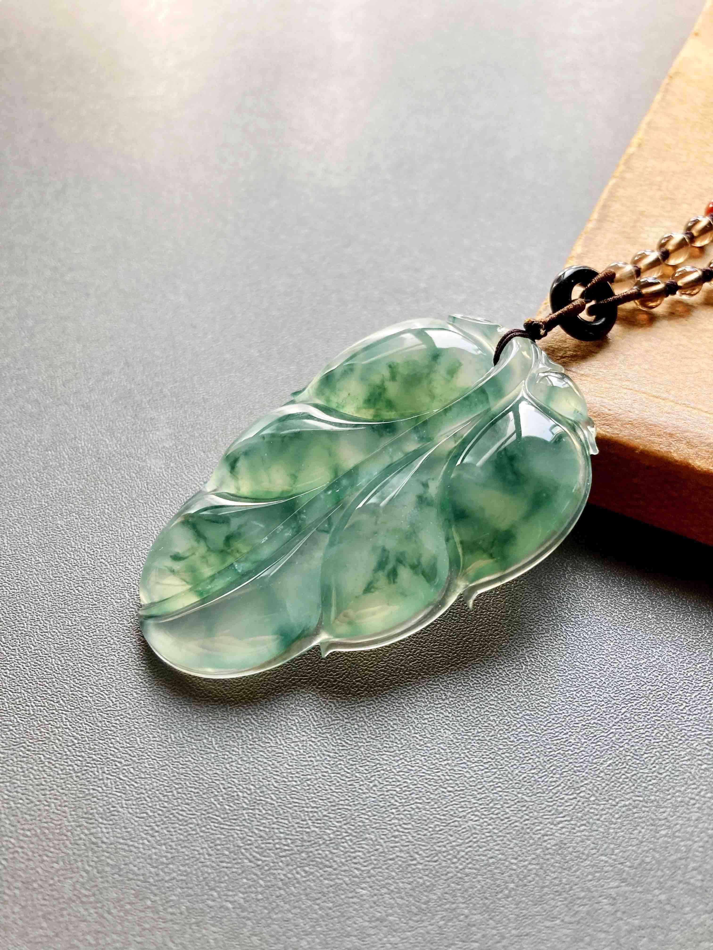 这么大的富贵宝贝,稀有冰种飘花大叶子,事业有成,如此好的种水能有这么大,太难得了,晶莹剔透,荧光四射,飘花如山水画一般,肥厚大气的造型让人一见倾心,59.4*38.5*6.6mm,大尺寸,男生也可以戴,寓意事业有成