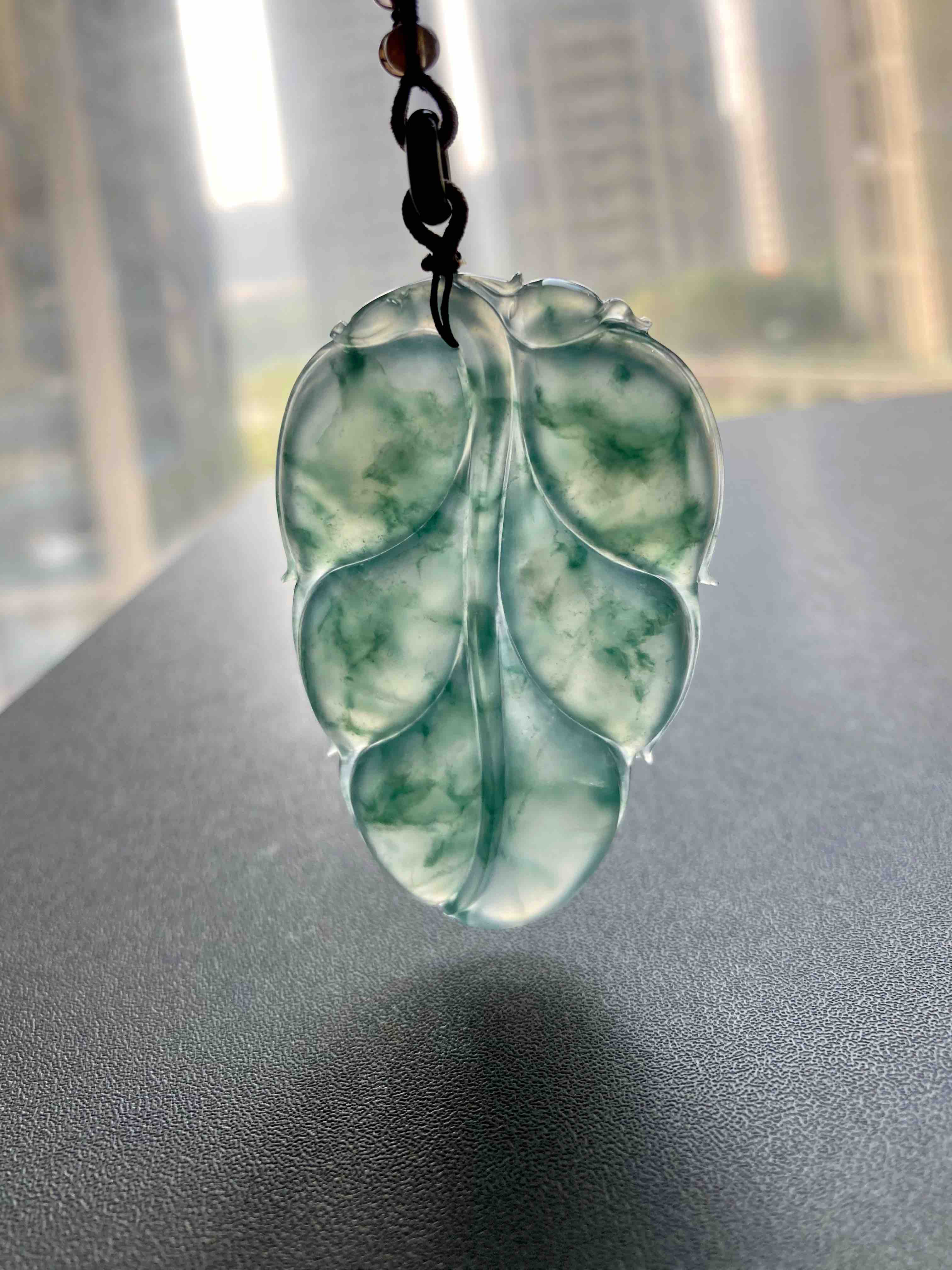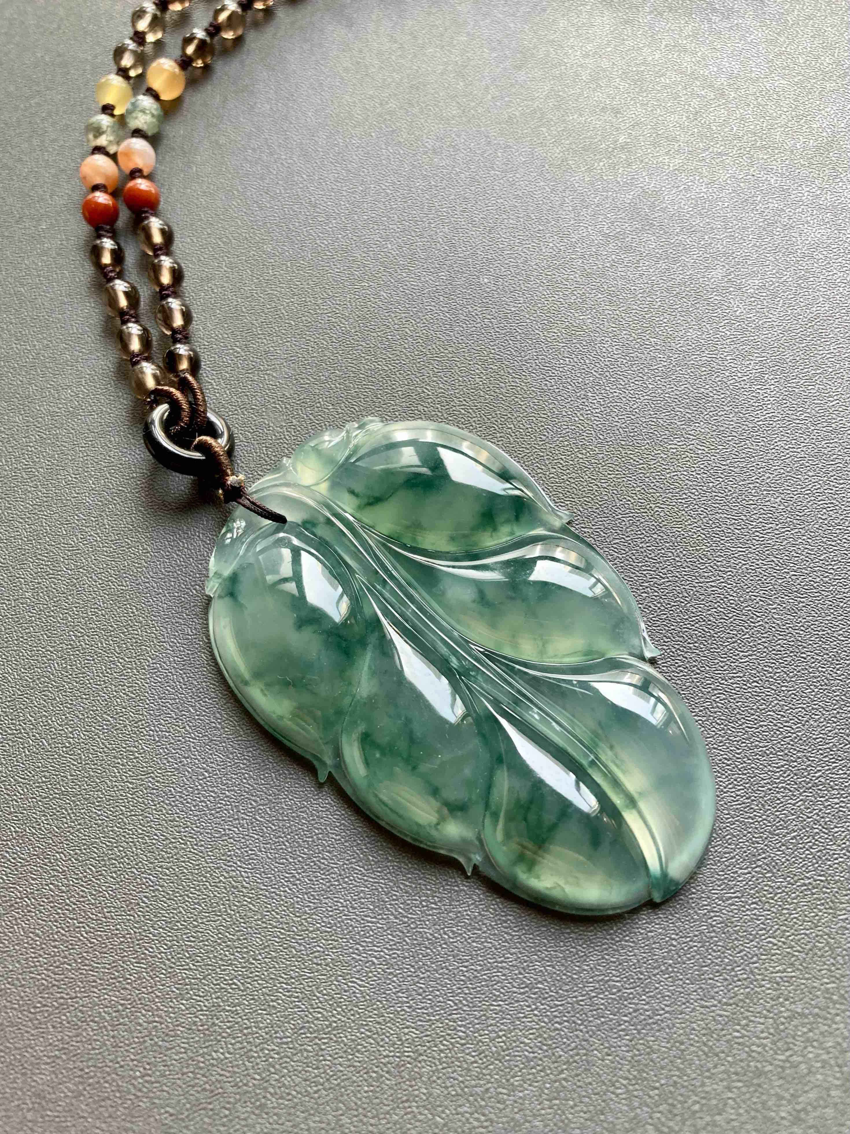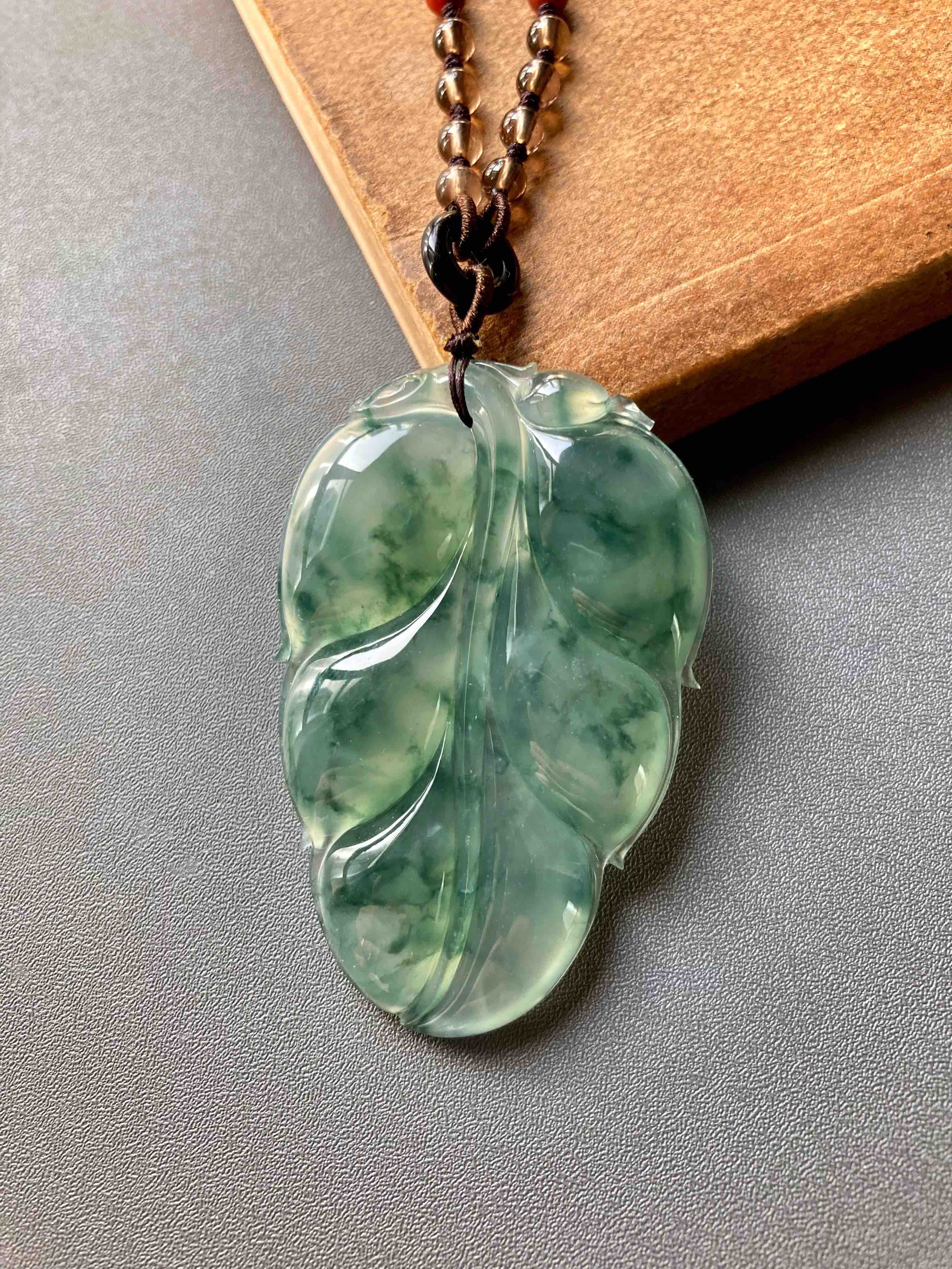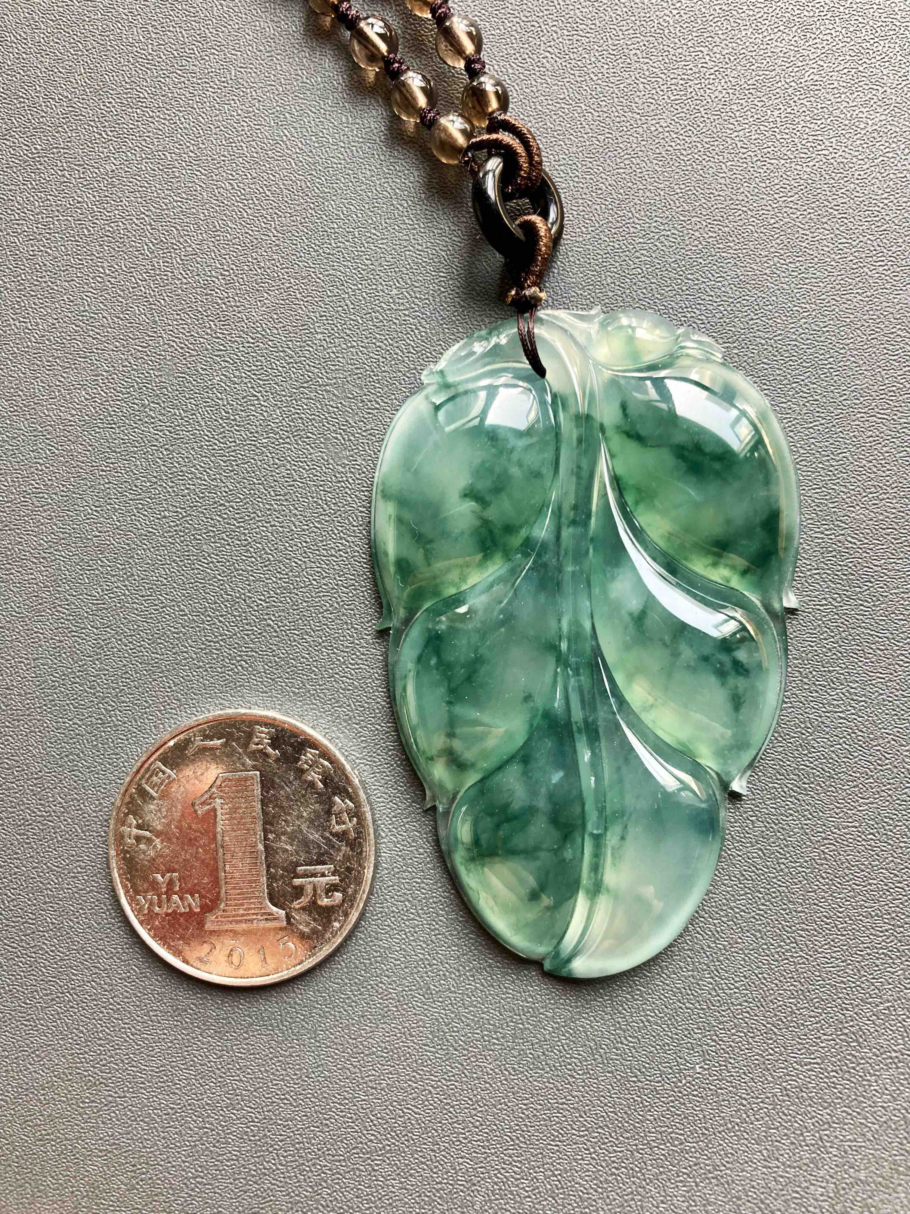 这么大的富贵宝贝,稀有冰种飘花大叶子,事业有成,如此好的种水能有这么大,太难得了,晶莹剔透,荧光四射,飘花如山水画一般,肥厚大气的造型让人一见倾心,59.4*38.5*6.6mm,大尺寸,男生也可以戴,寓意事业有成