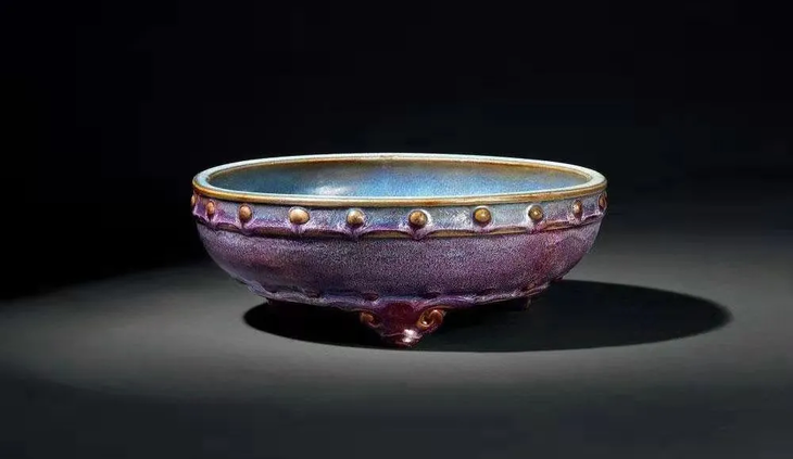 ▲ 宋·钧窑玫瑰紫釉鼓钉三足洗 故宫博物院藏