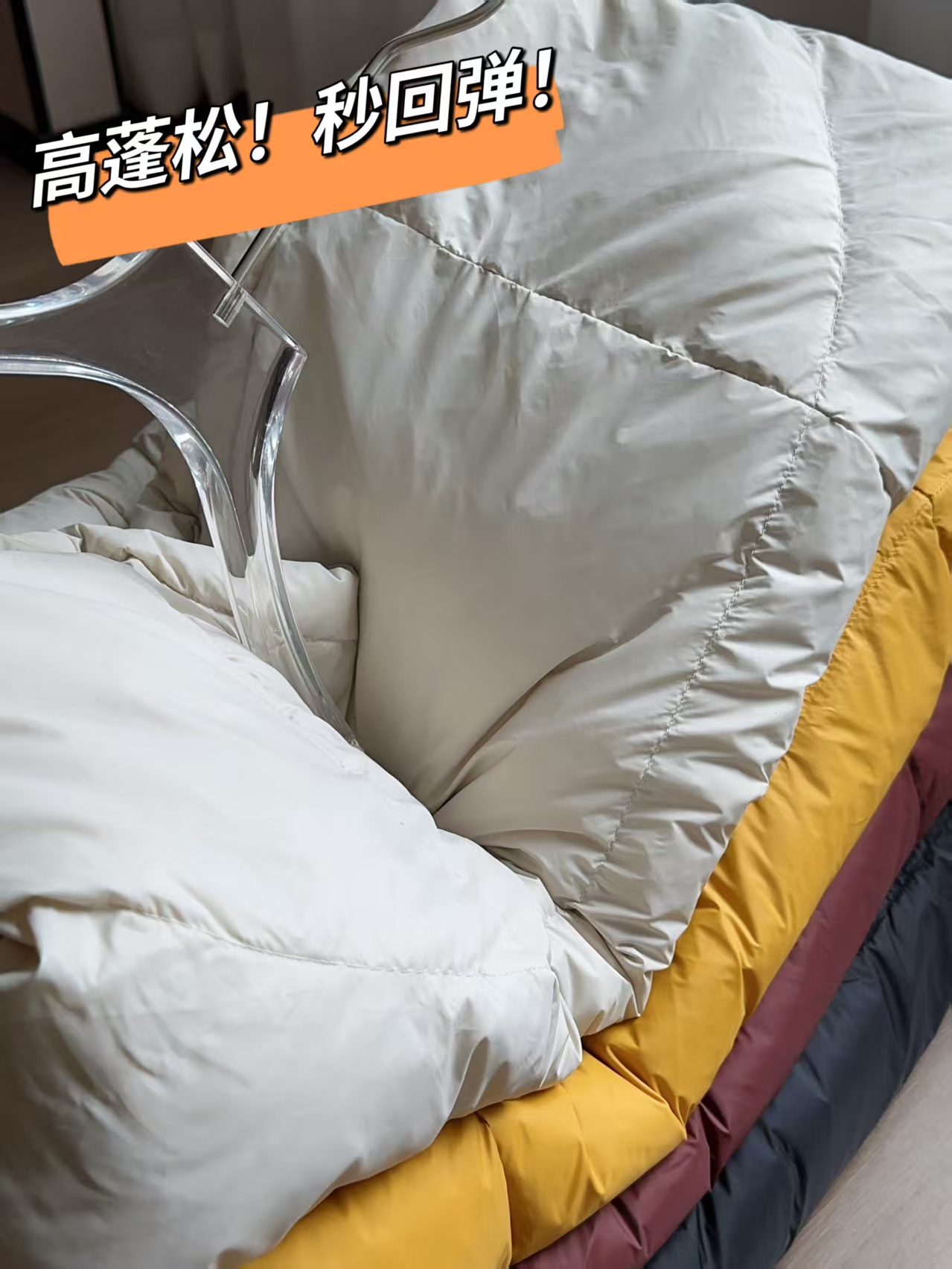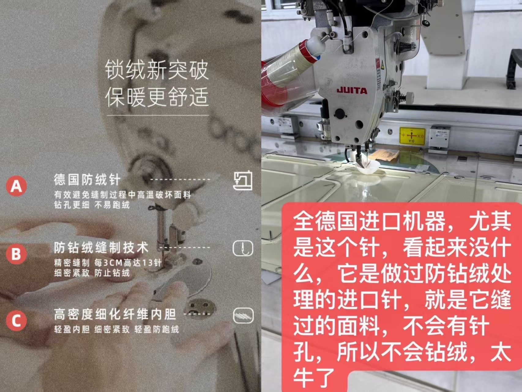 分隔填充,四重锁绒,拒绝钻绒跑绒。