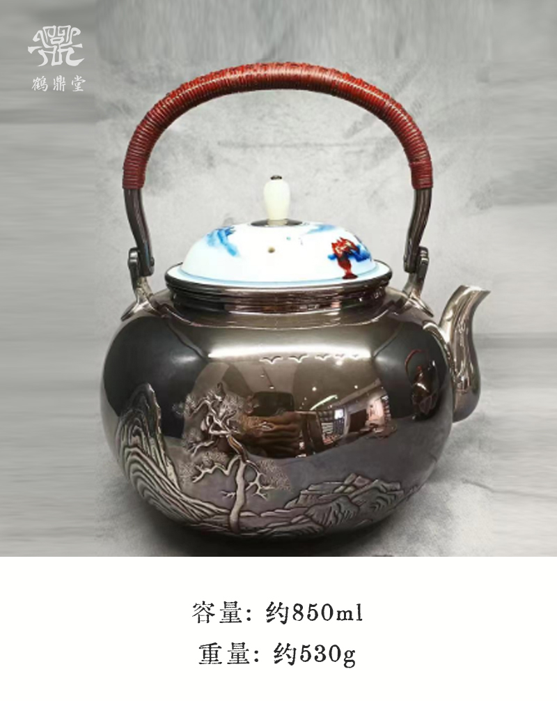 鹤鼎堂银壶闻天系列鱼丽汤沸青花釉里红瓷盖錾刻山水(银色)(缺货)