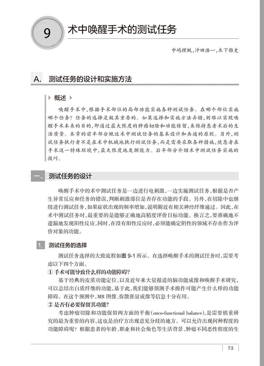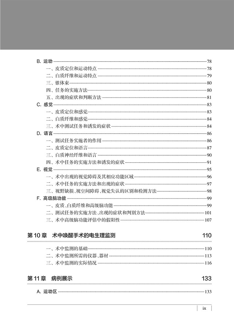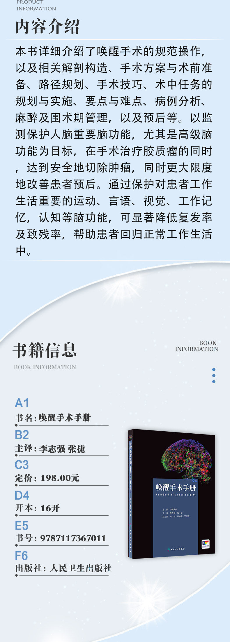 本书详细介绍了唤醒手术的规范操作,以及相关解剖构造、手术方案与术前准备、路径规划、手术技巧、术中任务的规划与实施、要点与难点、病例分析、麻醉及围术期管理,以及预后等。以监测保护人脑重要脑功能,尤其是高级脑功能为目标,在手术治疗胶质瘤的同时,达到安全地切除肿瘤,同时更大限度地改善患者预后。通过保护对患者工作生活重要的运动、言语、视觉、工作记忆,认知等脑功能,可显著降低复发率及致残率,帮助患者回归正常工作生活中。