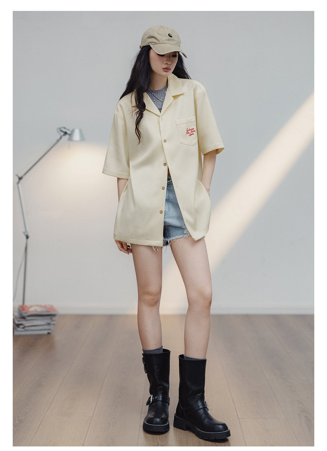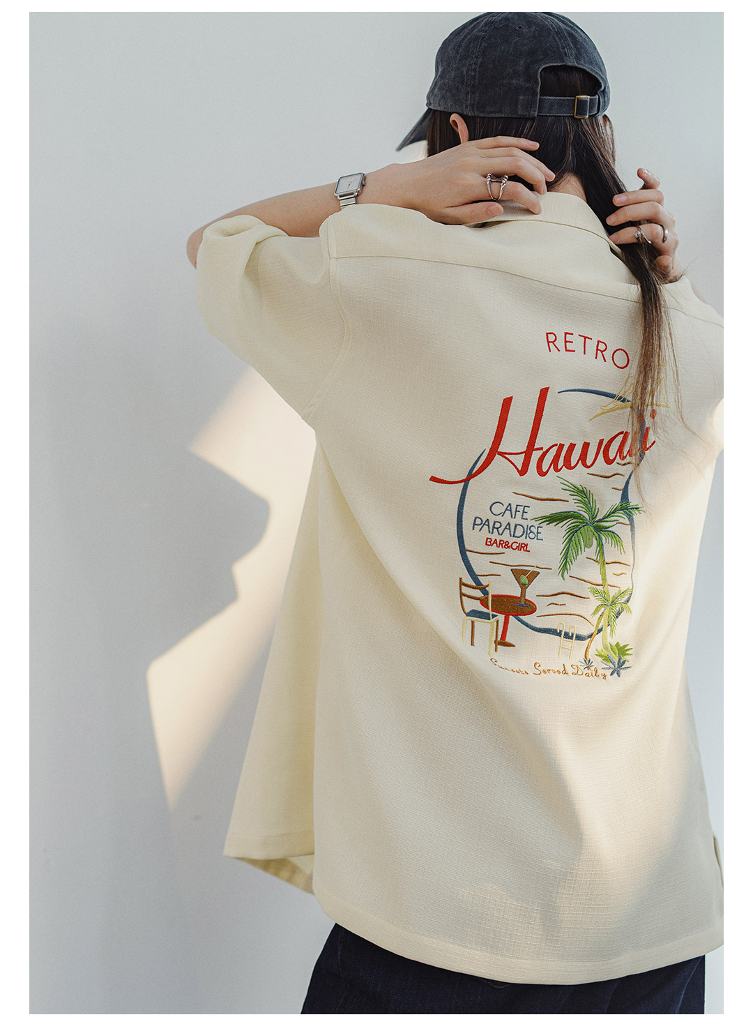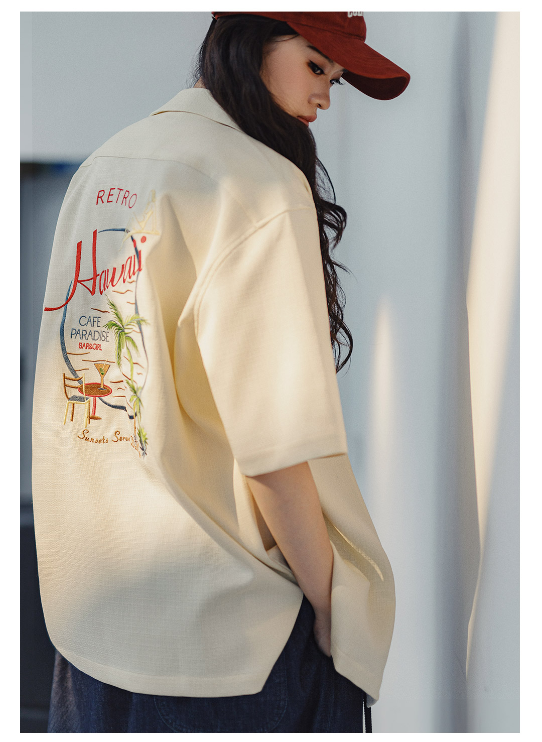 马登夏威夷风刺绣衬衫设计感宽松休闲T恤美式复古短袖衬衣夏季女