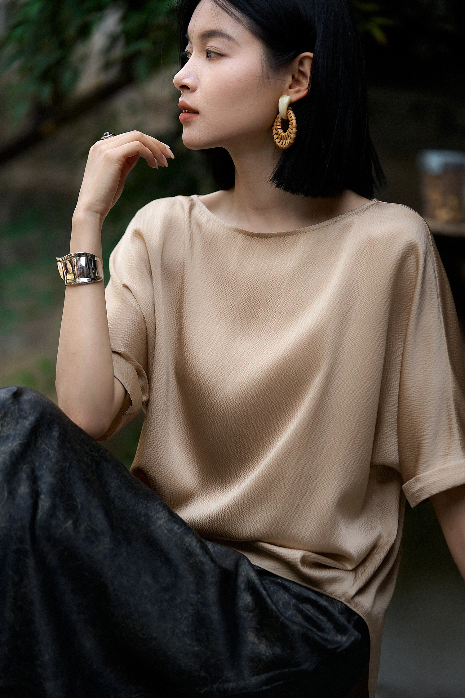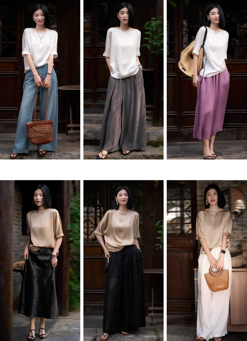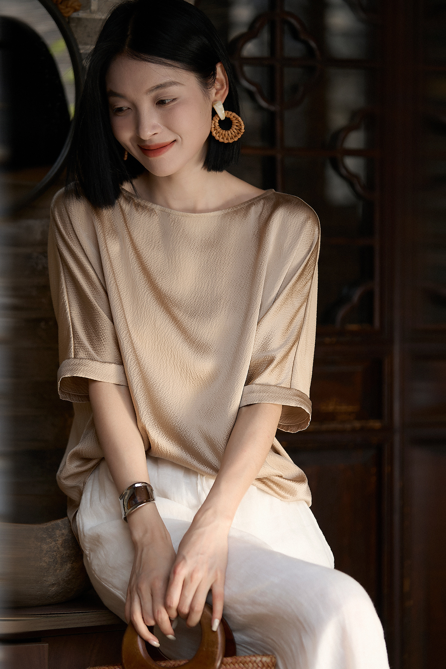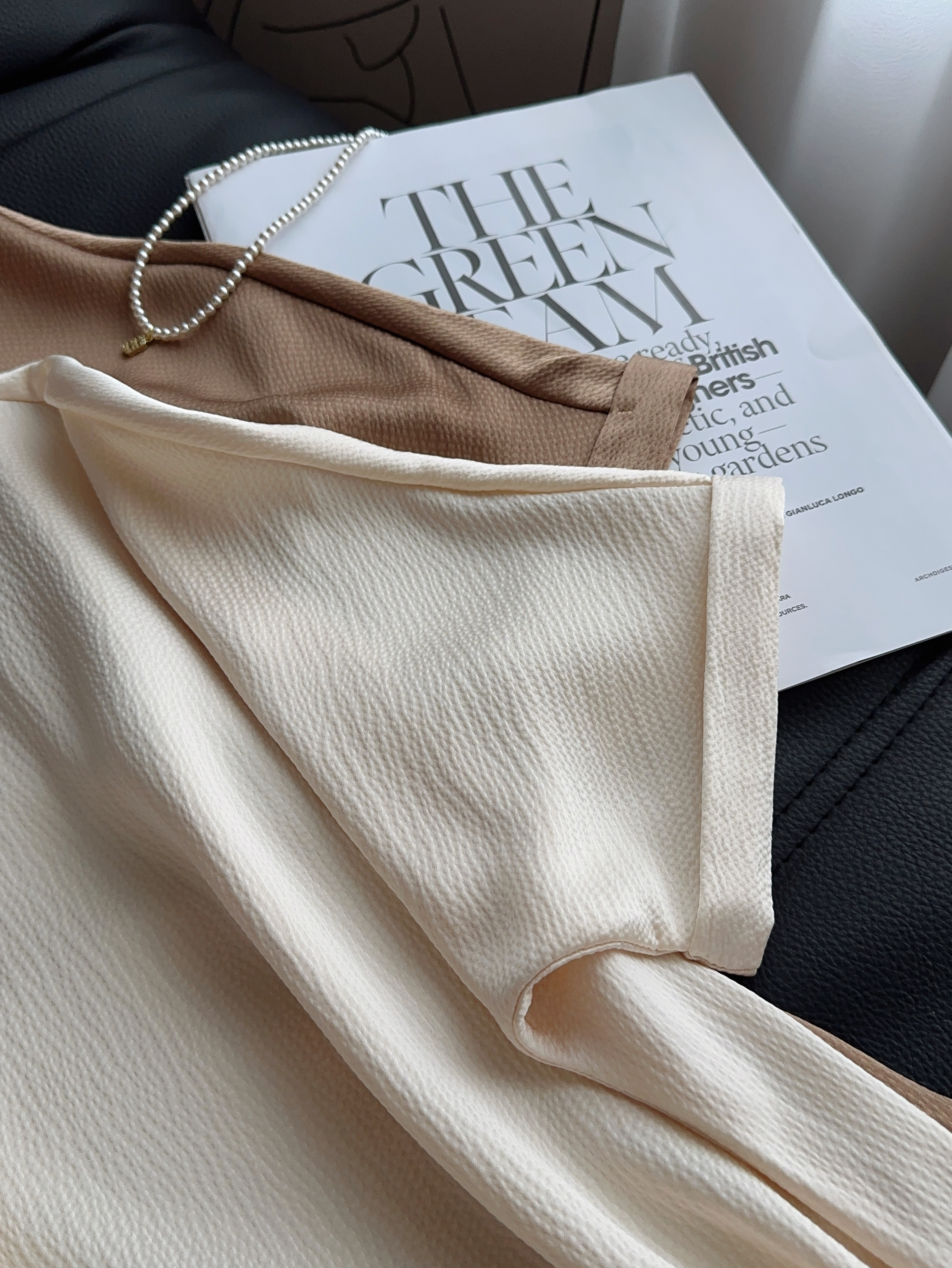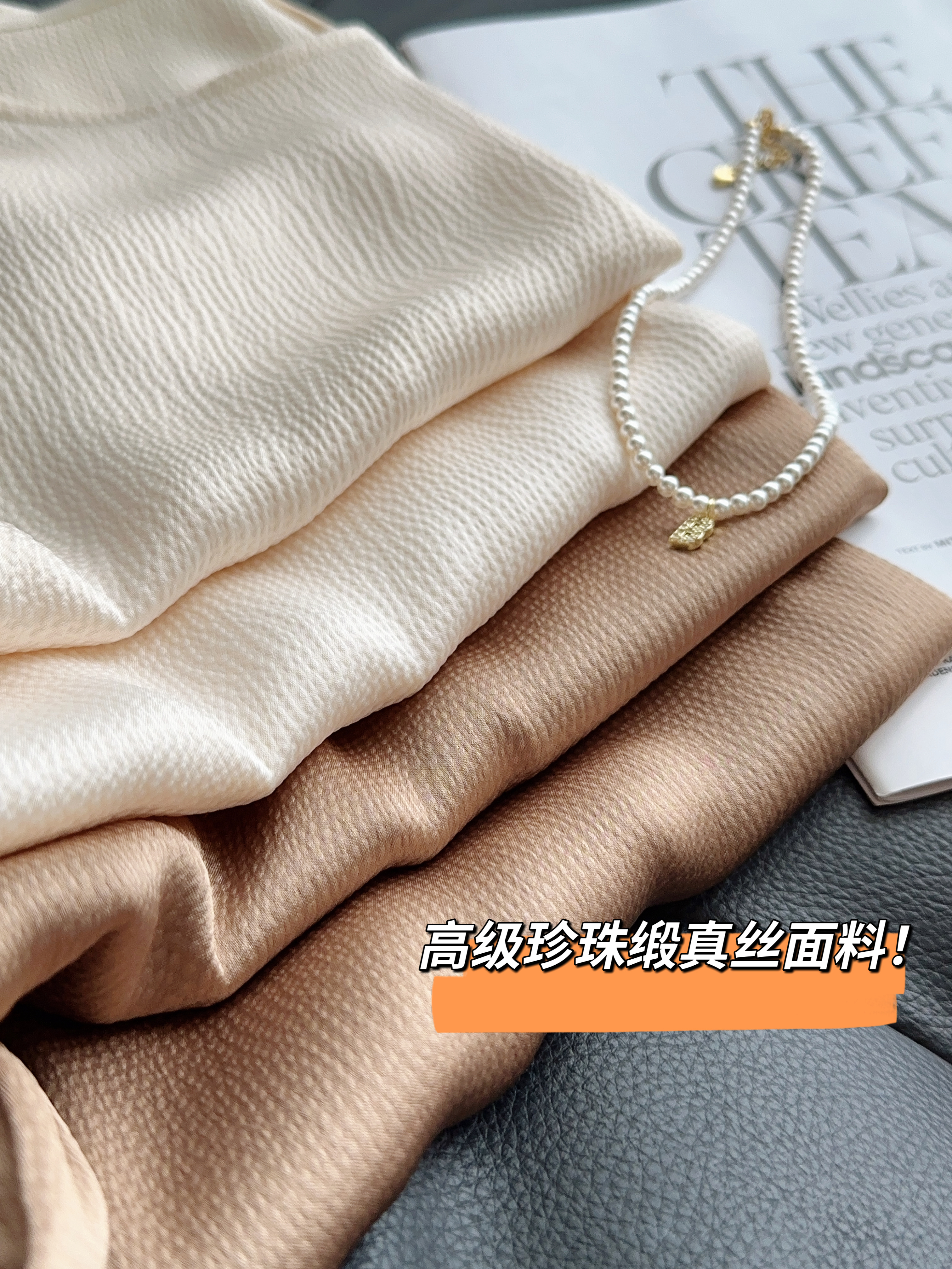 高级珍珠缎真丝面料,泛着珍珠般的莹润光泽, 触感细腻丝滑,宛如第二层肌肤般舒服!