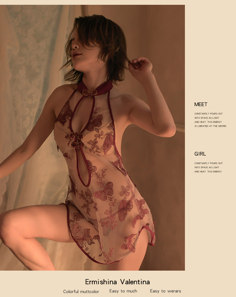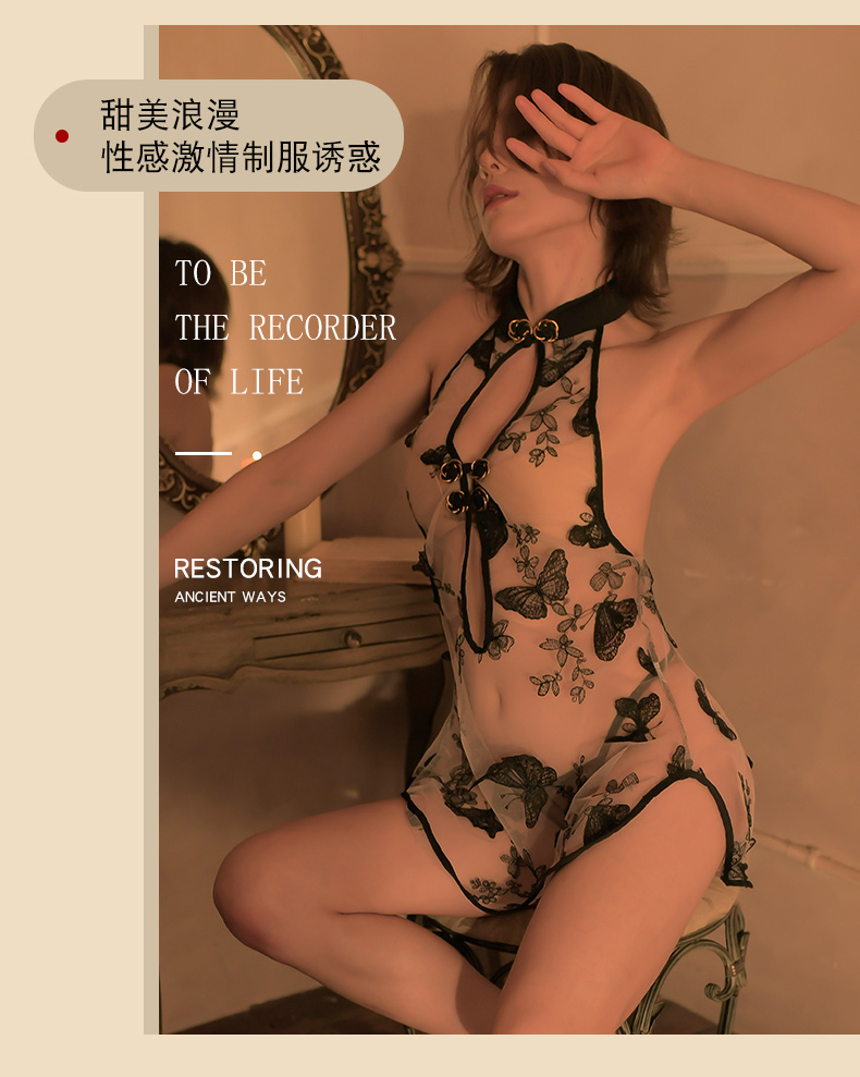 【性感睡裙】薄纱透视蝴蝶碎花新中式旗袍风睡裙 纯欲诱惑性感甜美情趣内衣睡衣6033