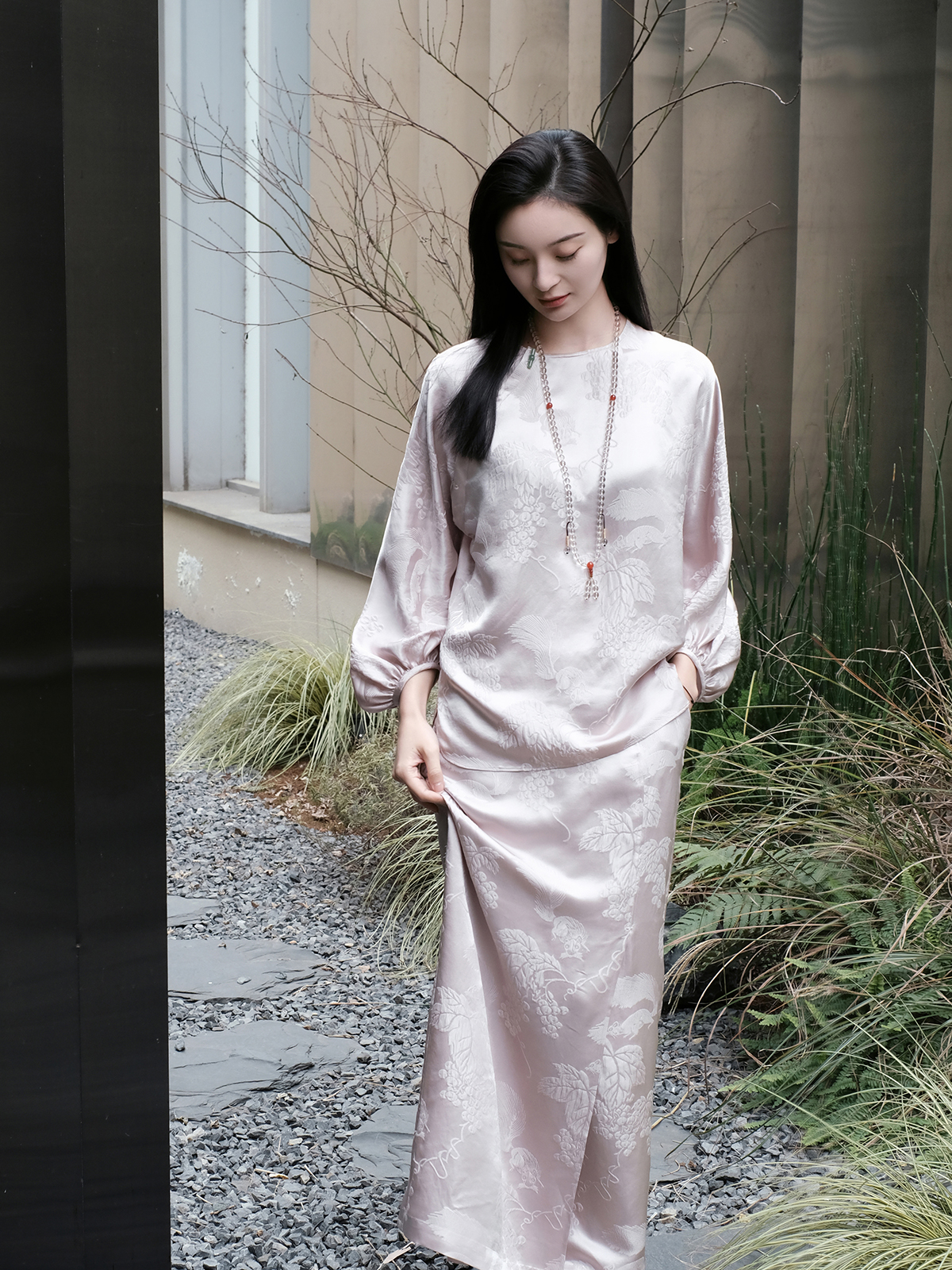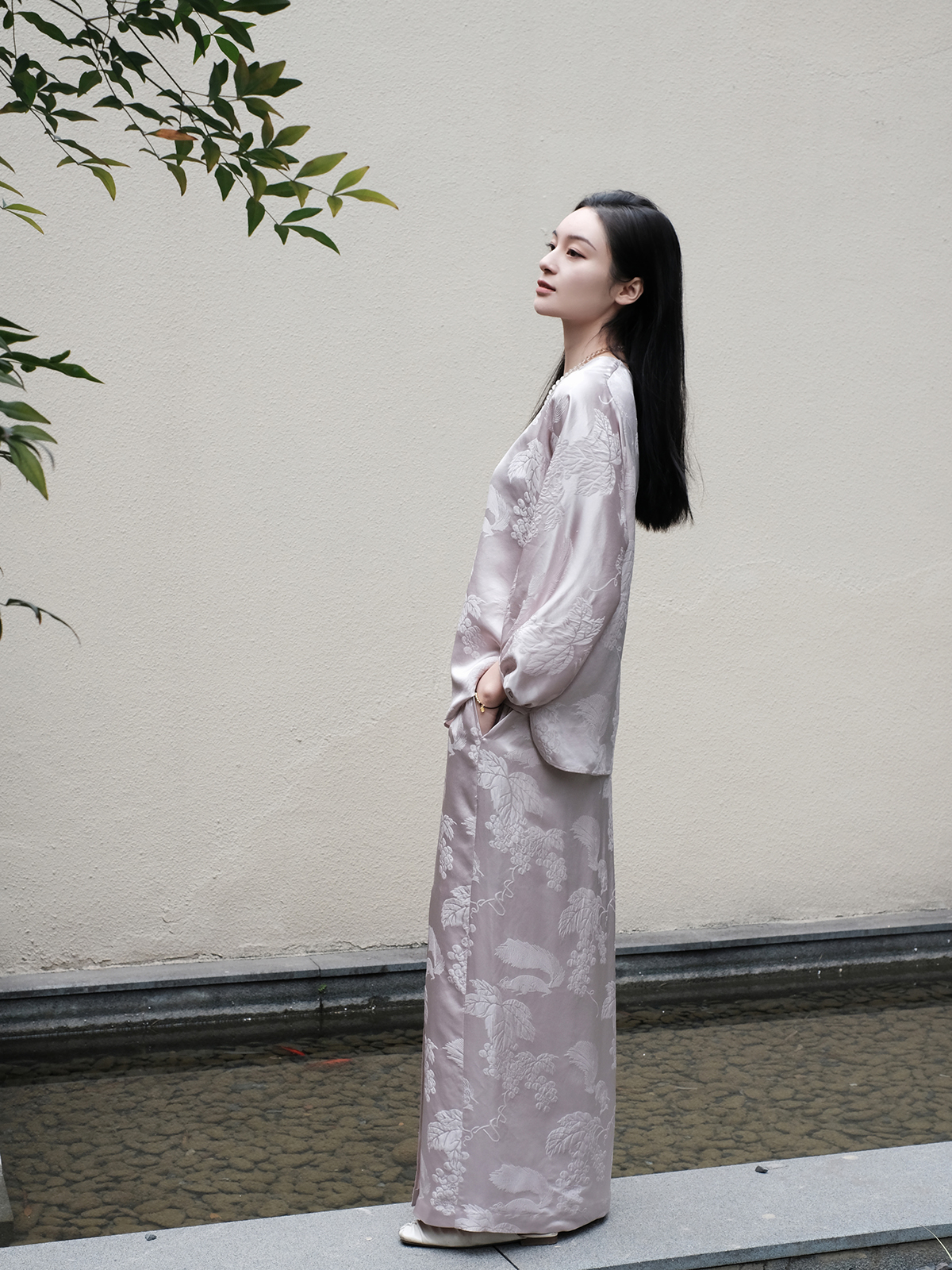 盛唐牡丹 |真丝提花阔腿裤珍珠白平腰版 (蝶恋花纹样)