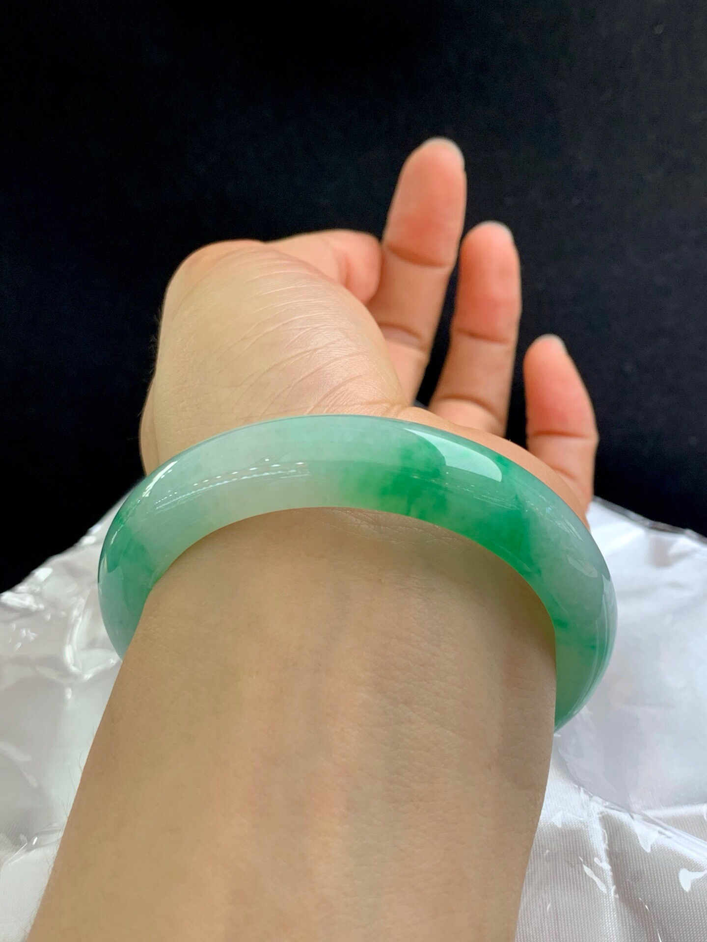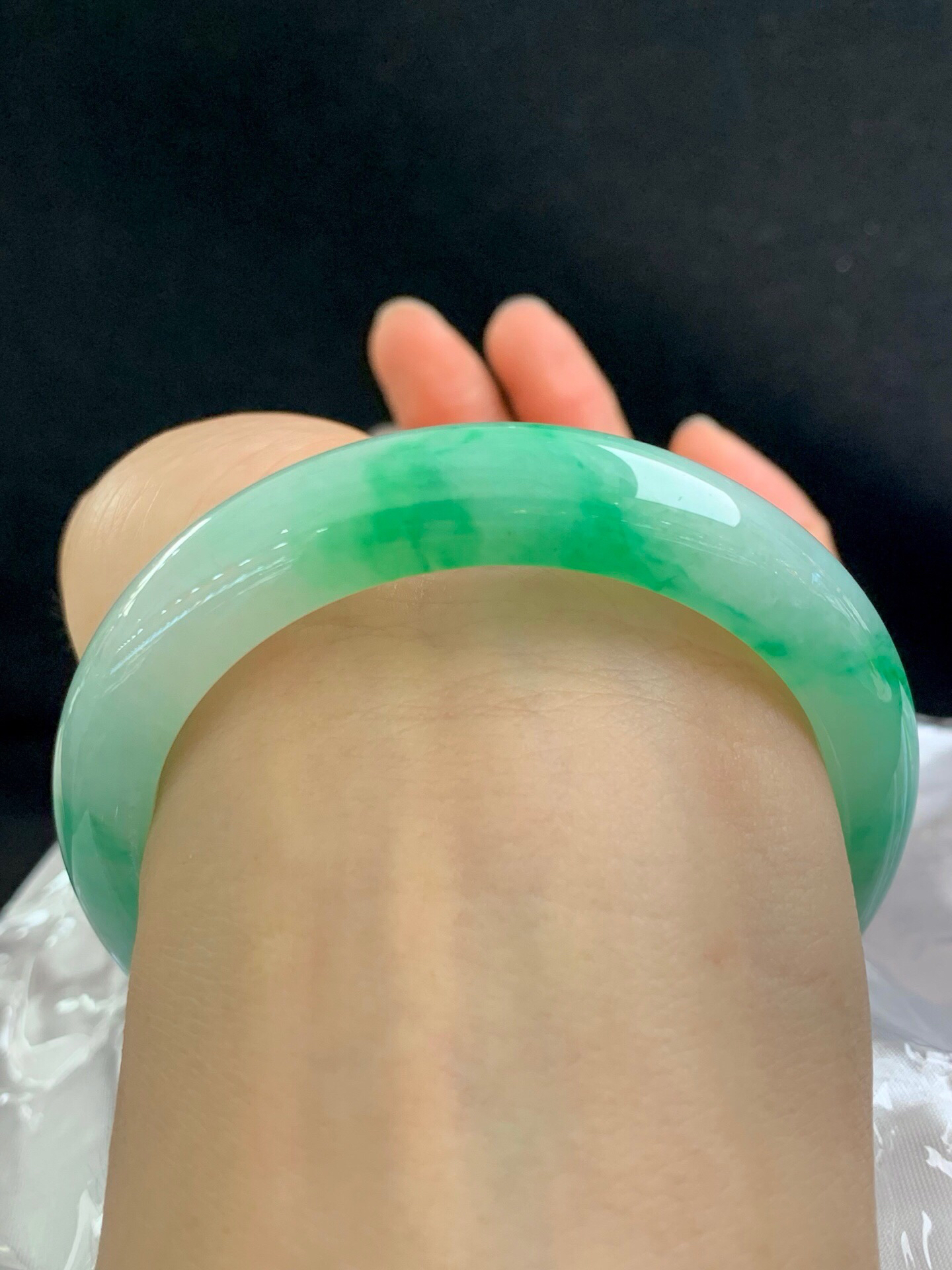620404,55.6圈口,糯冰飘绿正圈平安镯,白底飘阳绿,色辣,种水好,上手贵气,尺寸:55.6-12.5-8.3,超值价💰119000 #优石客珠宝#香玉荟萃