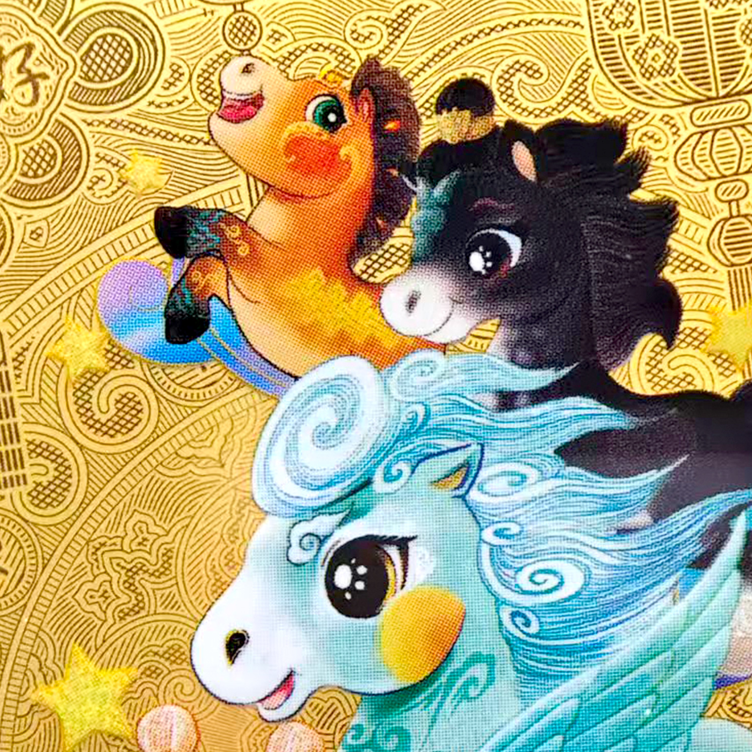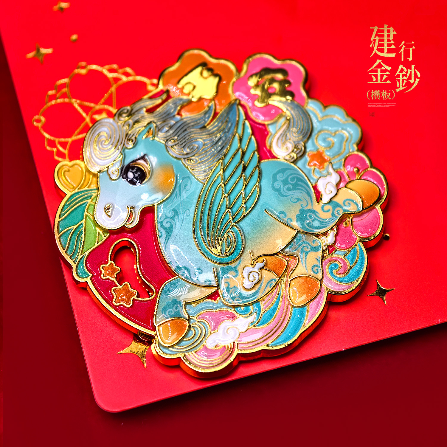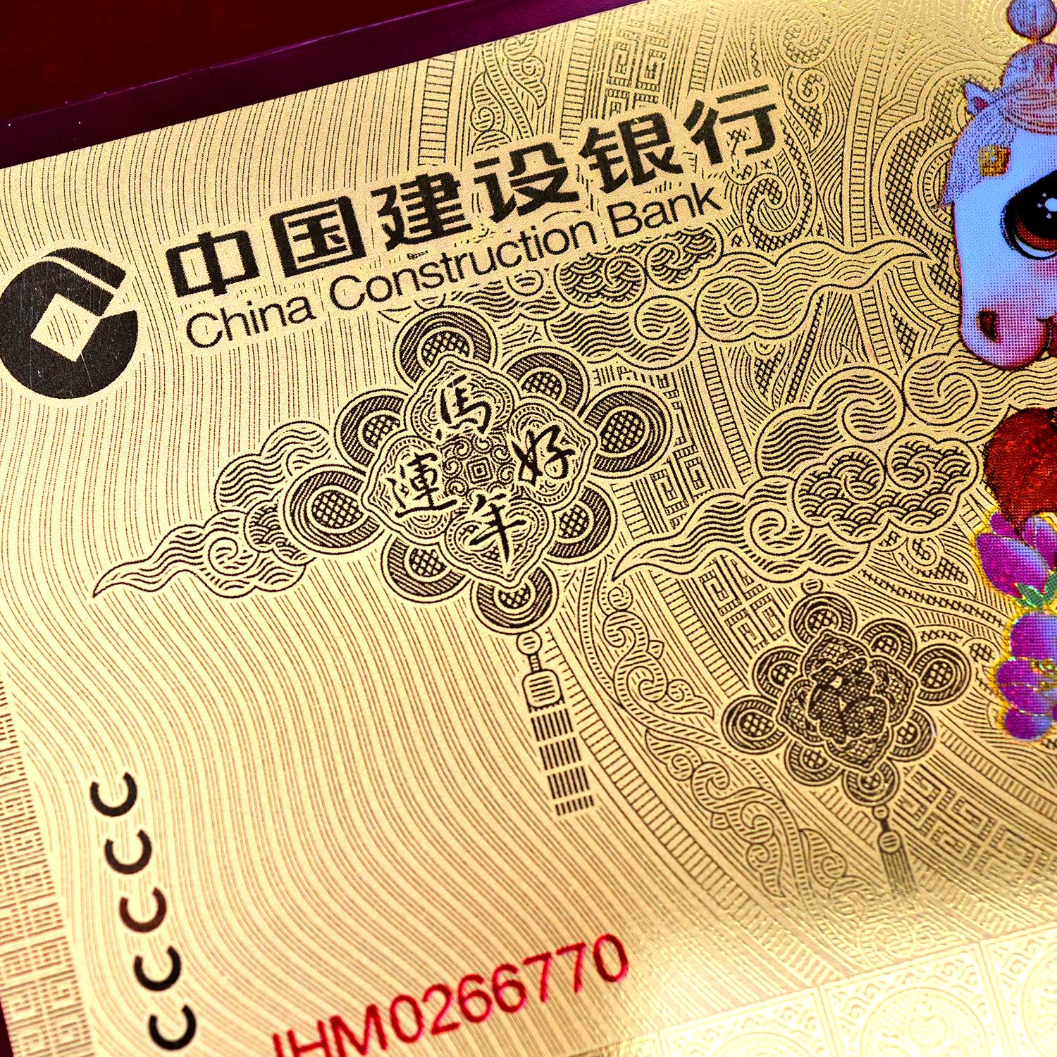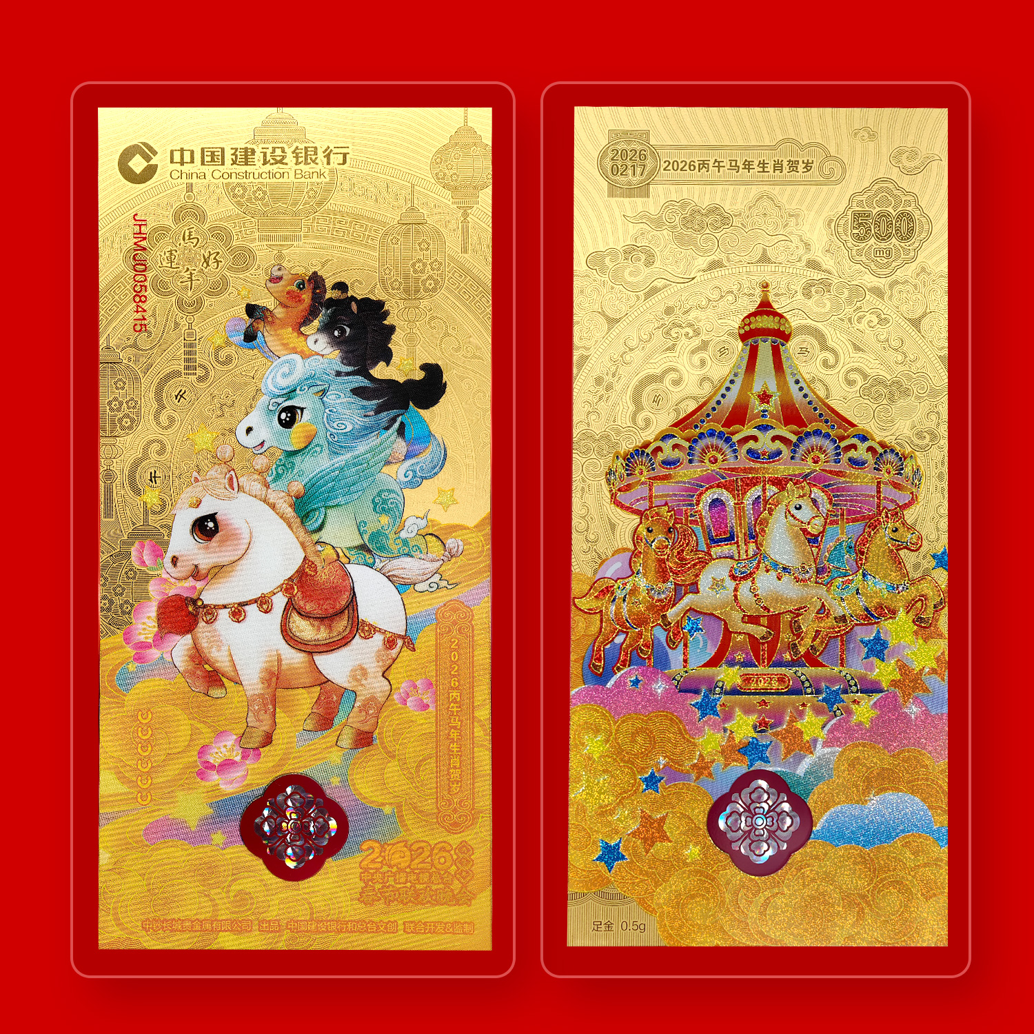 今年的建行金钞由中国建设银行和CCTV马年春晚联合开发研制,由中钞长城贵金属制作!超权威!以央视春晚“骐骥驰骋”四匹生肖小马驹形象打造,每张含0.5克足金!