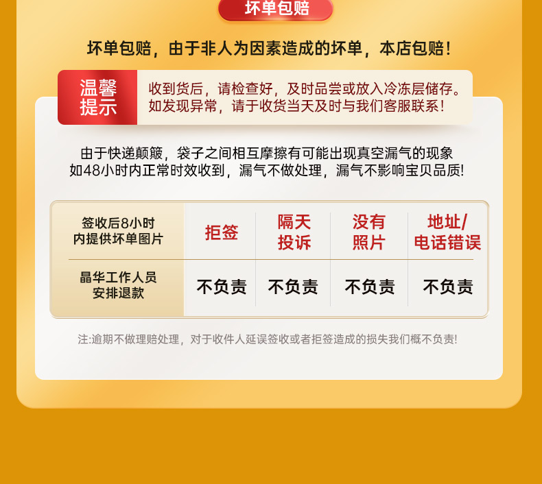 3.冷冻食品请确定好信息下单,下单后不支持7天无理由退换货/更改地址,部分更改地址需收取费用(费用快递收取),请留意