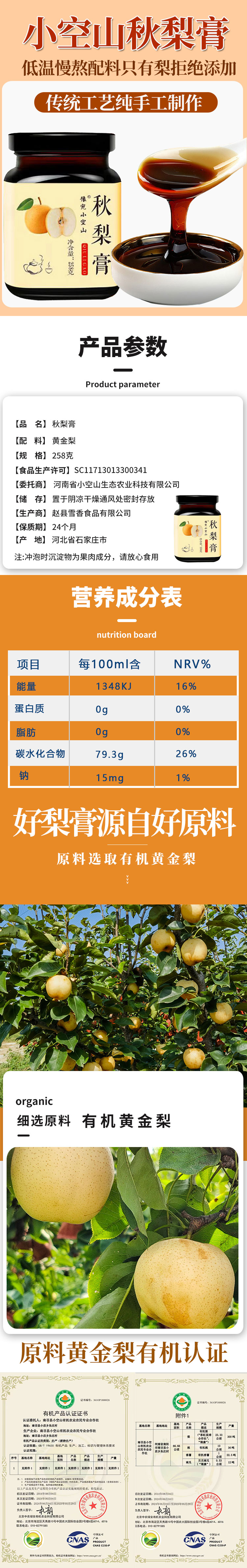 【厂商直发】小空山秋梨膏258g/瓶配料只有梨不加一滴水四季长备包邮