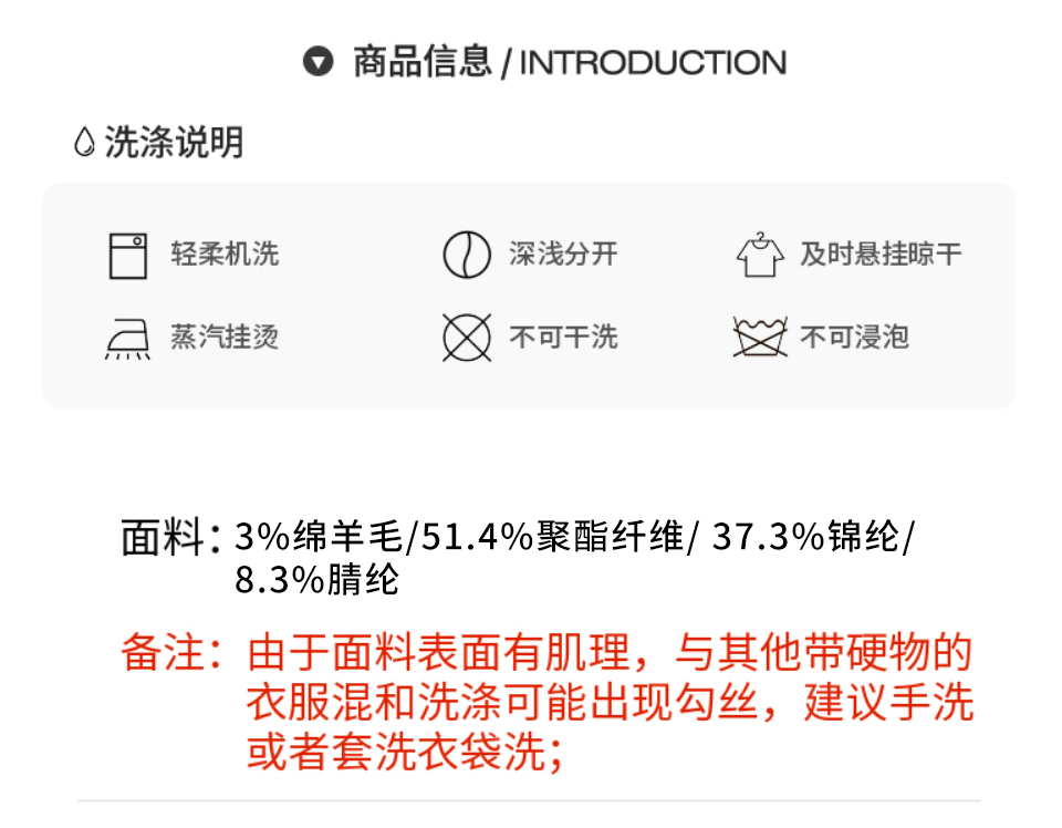 | 【注意事项】 | 由于面料表面有肌理,与其他带硬物的衣服混和洗涤可能出现勾丝,建议手洗或者套洗衣袋洗。 | ||