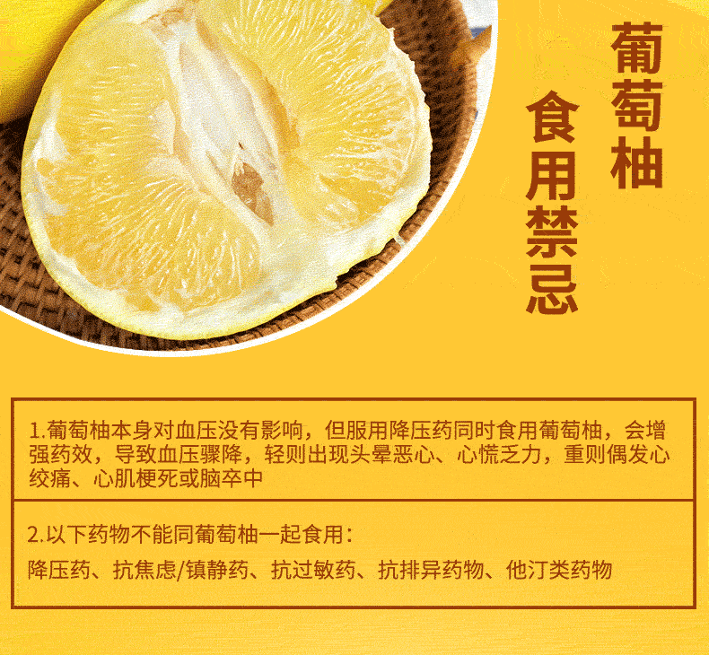 1.葡萄柚本身对血压没有影响,但服用降压药同时食用葡萄柚,会增强药效,导致血压骤降,轻则出现头晕恶心、心慌乏力,重则偶发心绞痛、心肌梗死或脑卒中