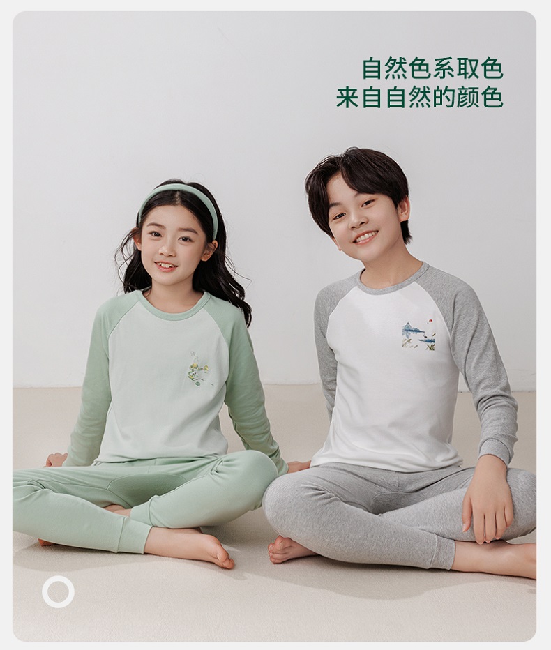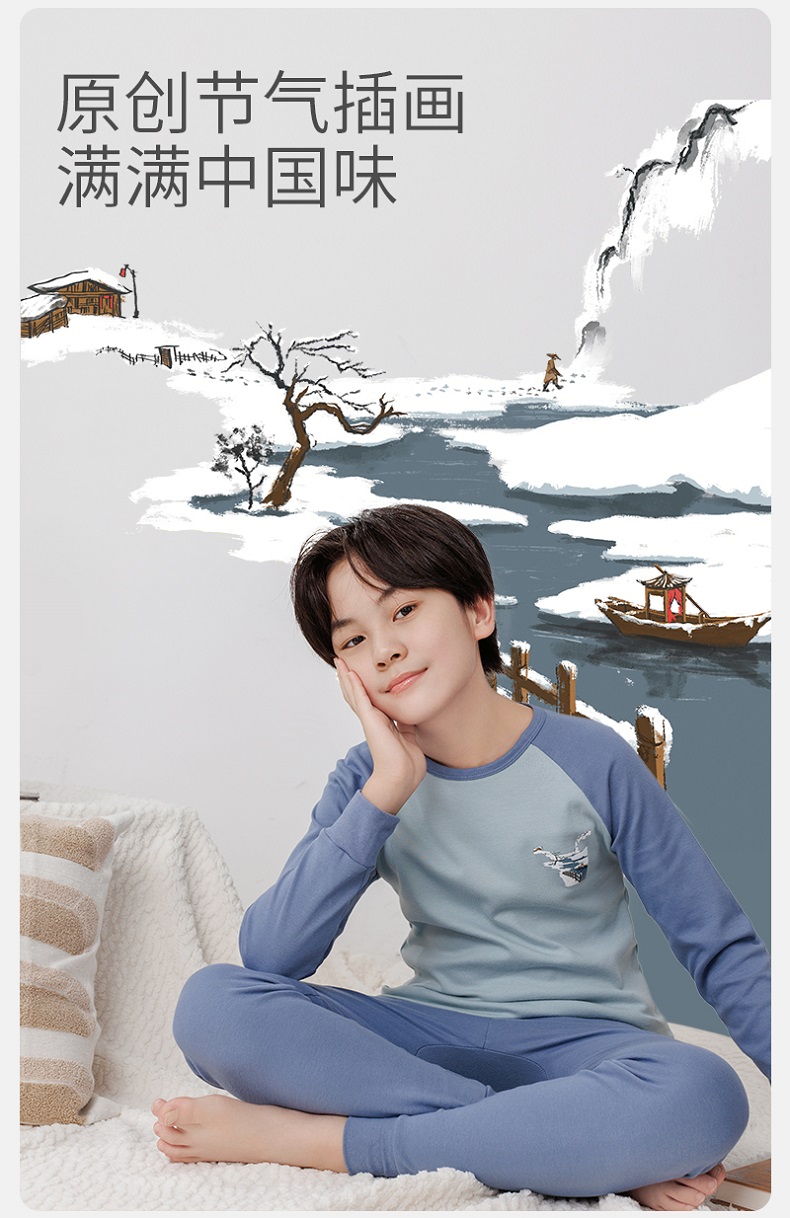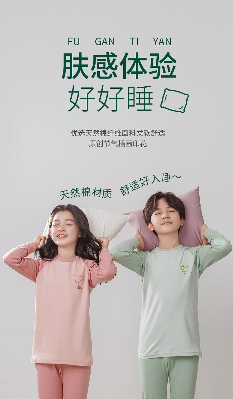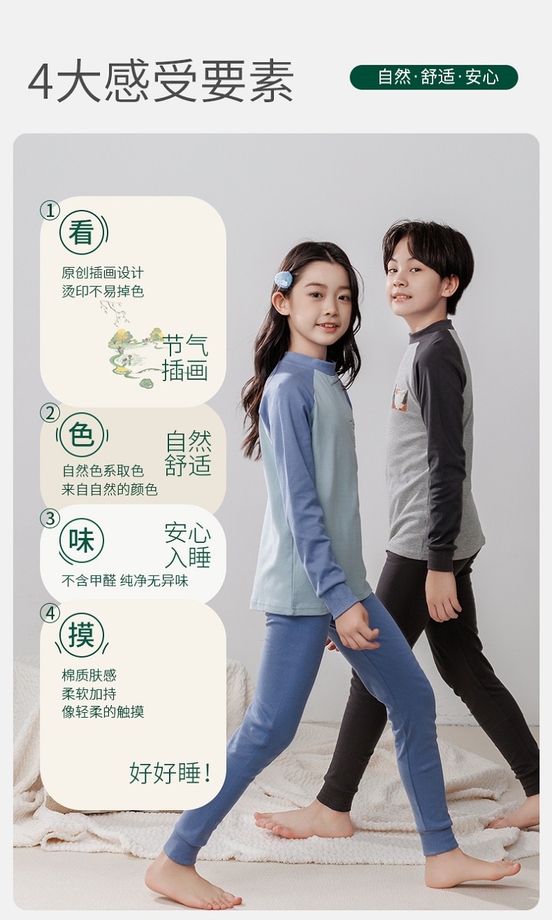 【A类纯棉,140-180cm】【原创设计,节气插画】【圆领+中领可选】秋冬新款儿童24节气纯棉圆领中领长袖保暖内衣中大童印花青少年家居服