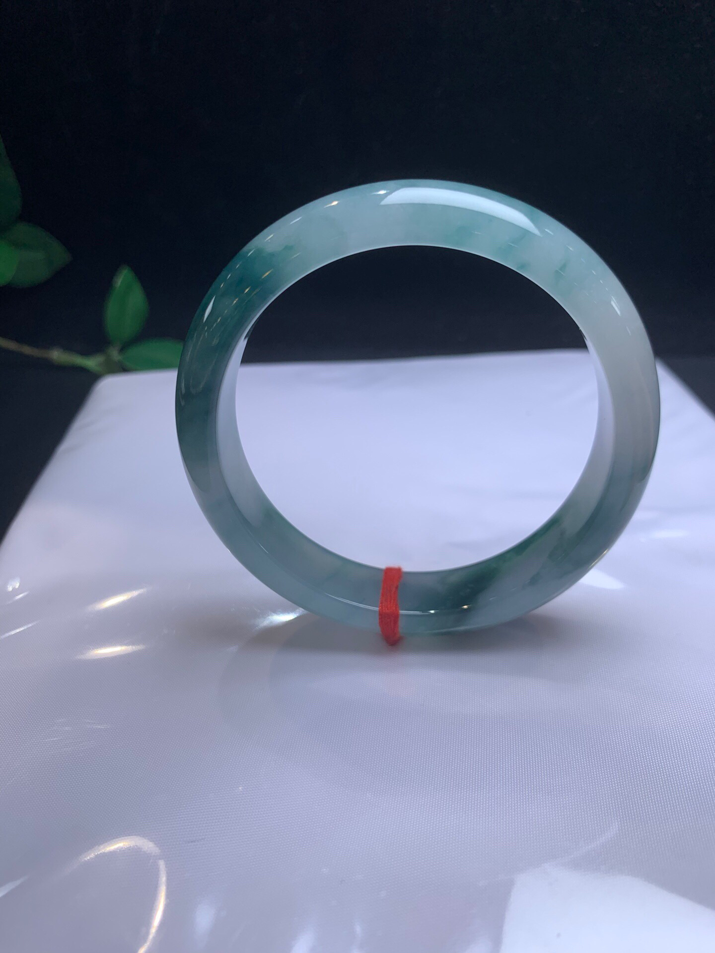 620711,55.3圈口,冰飘花正圈平安镯,老种,冰透起光,白底飘蓝花,条形秀气