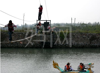 高空滑索是一项勇敢者的运动,游客们穿戴好吊具,挂在滑动的小车上,双手抓紧滑索,从高处飞速地滑落,穿越过水面,到达湖心,让您感受更多的是新奇刺激。