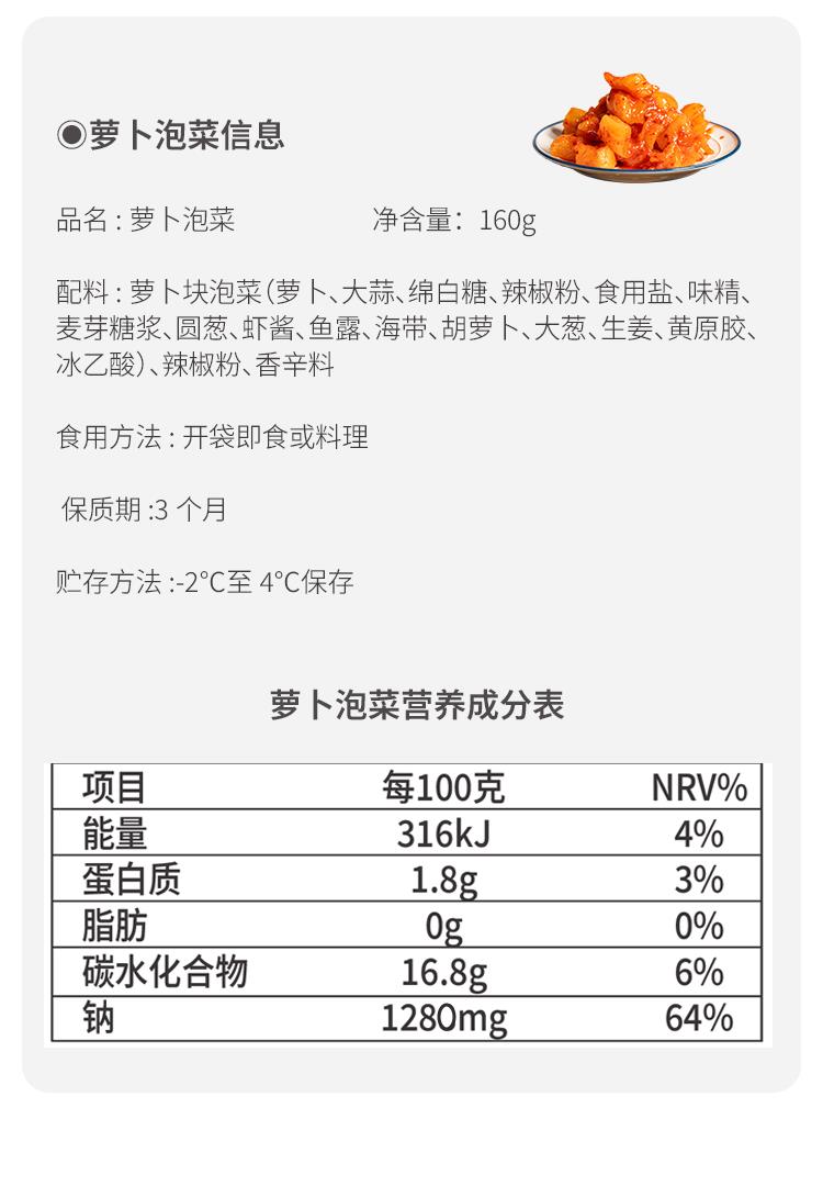 【配料表】萝卜块泡菜(萝卜、大蒜、绵白糖、辣椒粉、食用盐、味精、麦芽糖浆、圆葱、虾酱、鱼露、海带、胡萝卜、大葱、生姜、黄原胶、冰乙酸)、辣椒粉、香辛料