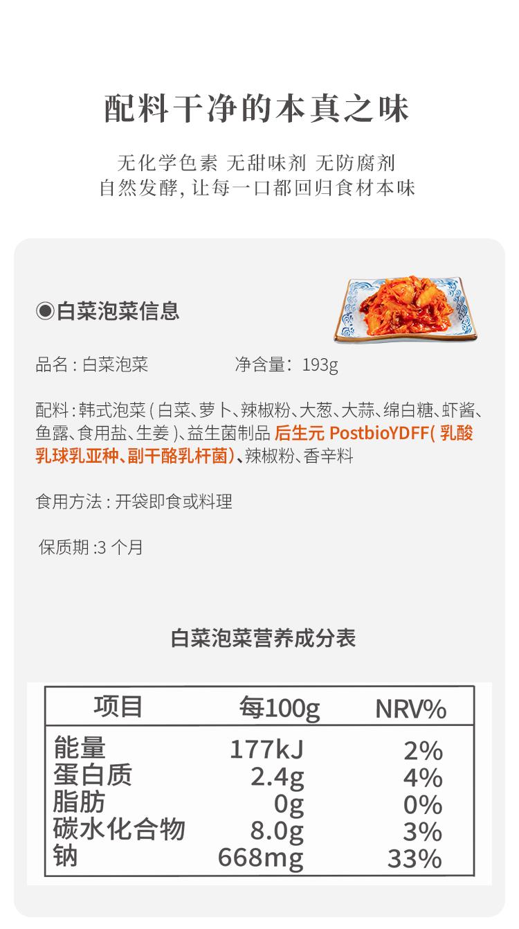 【配料表】韩式泡菜(白菜、萝 卜、辣椒粉、大葱、大蒜、绵白糖、虾酱鱼露、食用盐、生姜)、益生菌制品 后生元 PostbioYDFF(乳酸乳球乳亚种、副干酪乳杆菌)、辣椒粉、香辛料