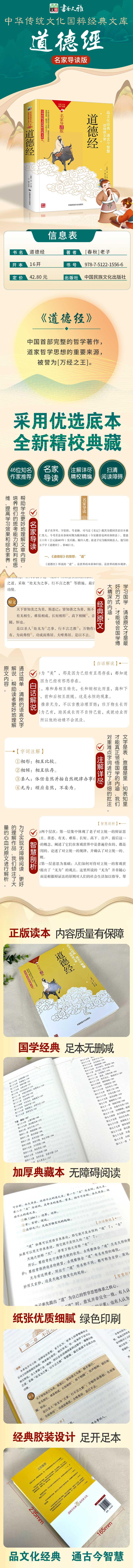 道德经》 ·中国首部完整的哲学著作,道家哲学思想的重要来源,被誉为“万经之王” ·蕴含丰富的内容和深邃的哲理,是中华民族的文化瑰宝。 ·导读作家——王蒙:文化部原部长,茅盾文学奖获得者。多年来致力于传统文化研究。2019年获“人民艺术家”国家荣誉称号。