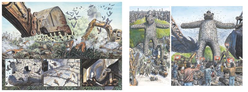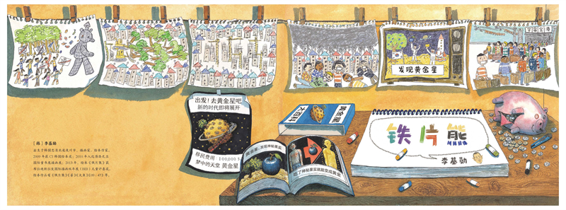 这是一本多格连环画形式的无字书,通过不同的画面尺寸,变化丰富的视角,获得了极强的运动感,其宽阔的横开本,配合上气势磅礴的构图,犹如银幕上的电影。铁片熊的故事,像极了古希腊神话中帮人类获得火种却牺牲了自己的普罗米修斯;在科幻的外壳下,有着指向我们生活的环境及其背后的社会伦理的深刻内核。