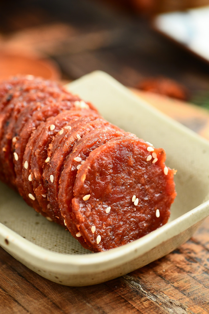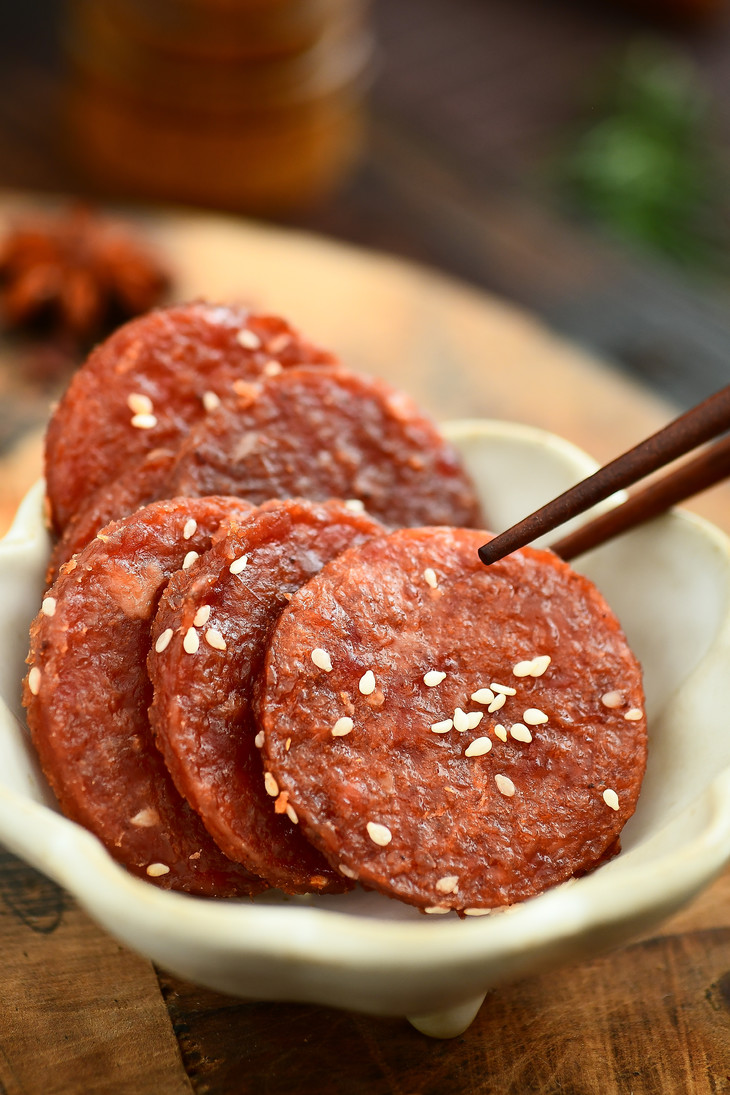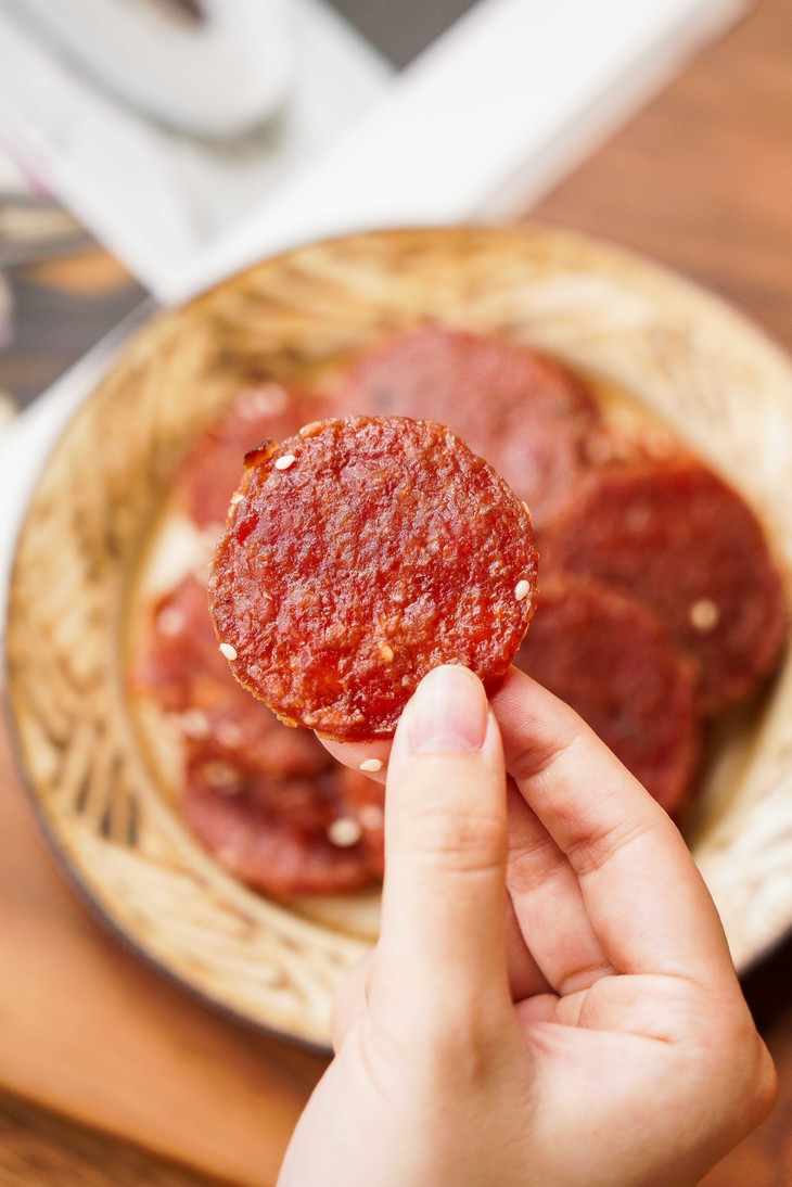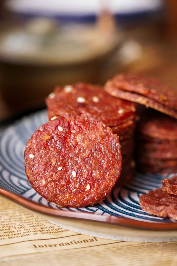 ✅ 圆模定型!大小厚度正好!芝麻增香加分! 真空搅拌的肉泥抹在定制的烤盘上, 填塞成一个个大小适中、厚度均匀的圆片。 尺寸和厚度,是老师傅根据烤肉脯的口感, 反复调试才确定下来的理想型!