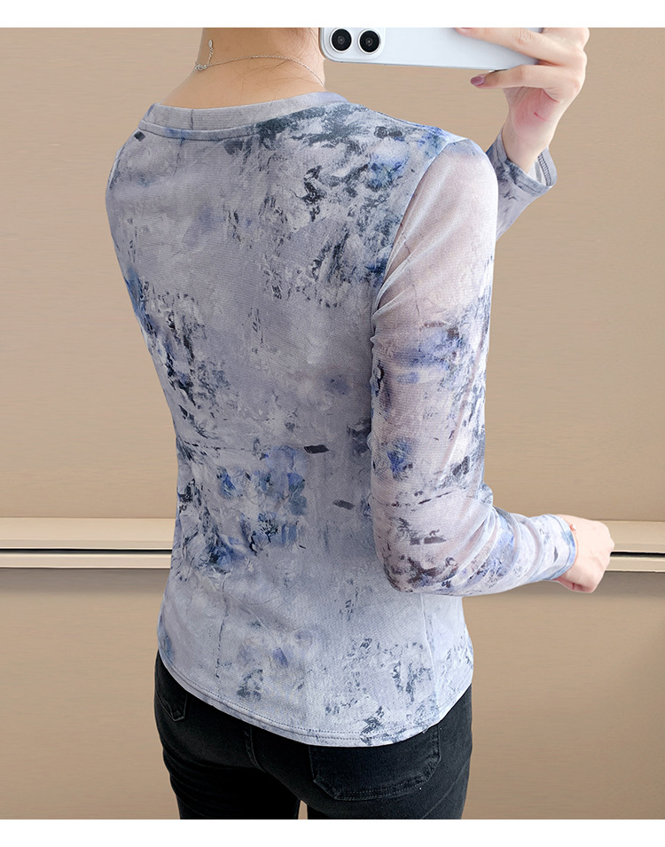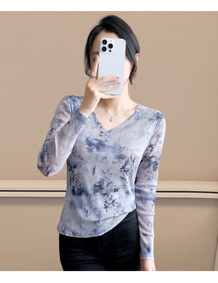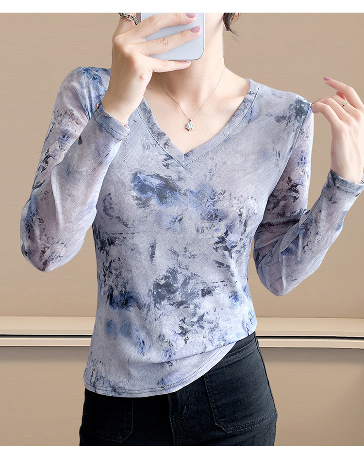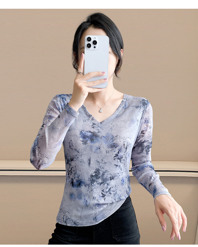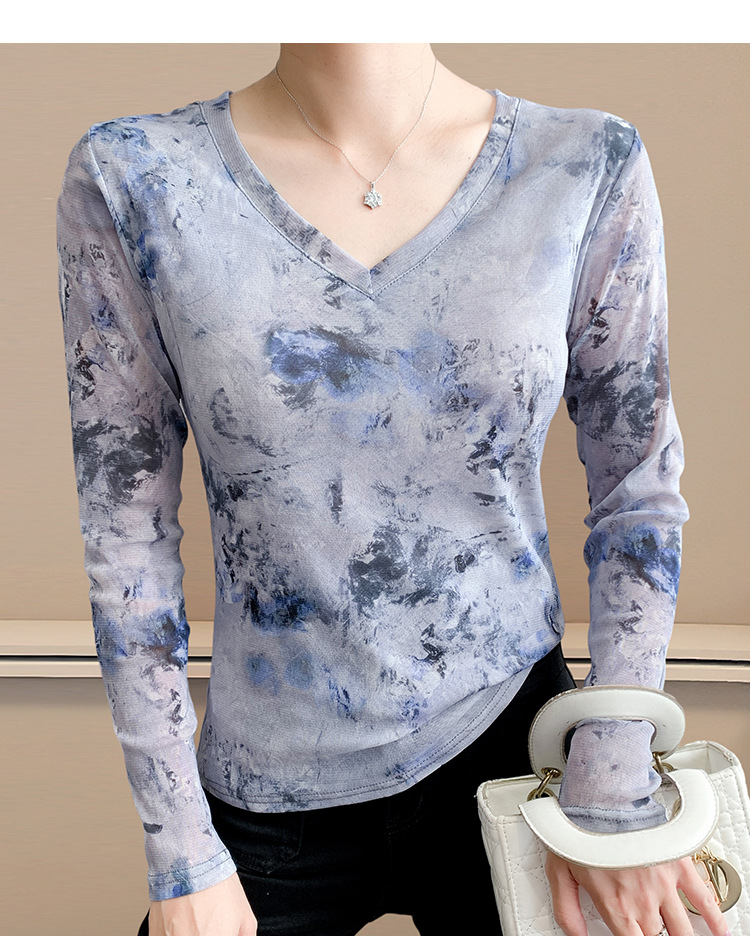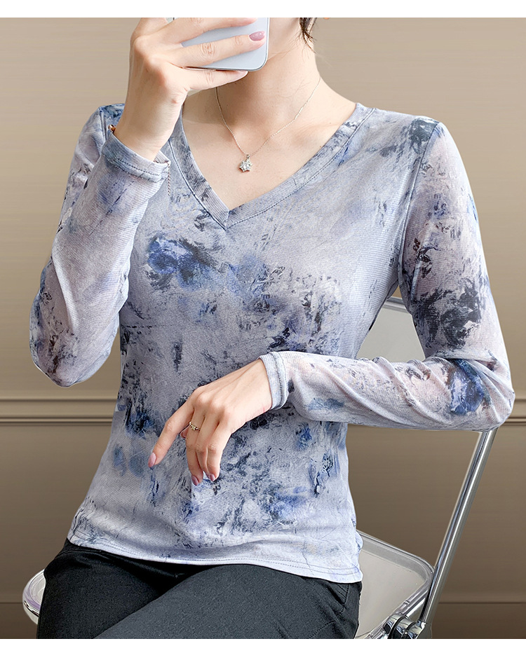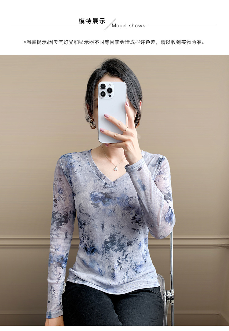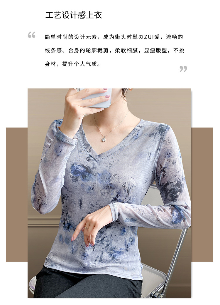 时尚洋气高弹网长袖,印花V领T恤打底衫上衣KQL-A55F8590