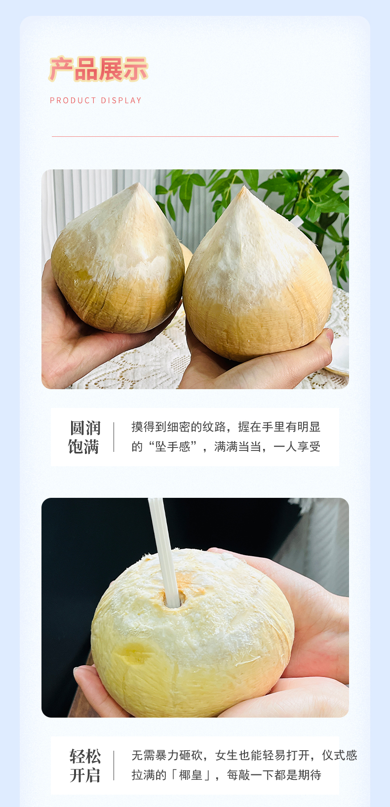 5.新鲜椰皇摇晃时有明显液体晃动声,如发现椰汁发酸或有霉味,椰肉变粉请勿食用。
